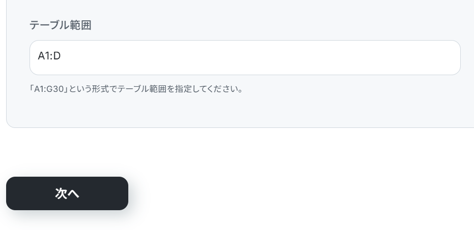 テーブル範囲は、項目名が入力されている部分も含めて、レコードを追加する対象範囲として設定しましょう。 テーブル範囲の設定方法について、詳しくは以下のリンク先をご確認ください。