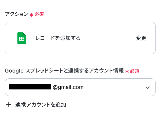 ステップ6:Google スプレッドシートにレコードを追加するアクションの設定 最後の項目を設定します。 「レコードを追加する」という項目をクリックしましょう。