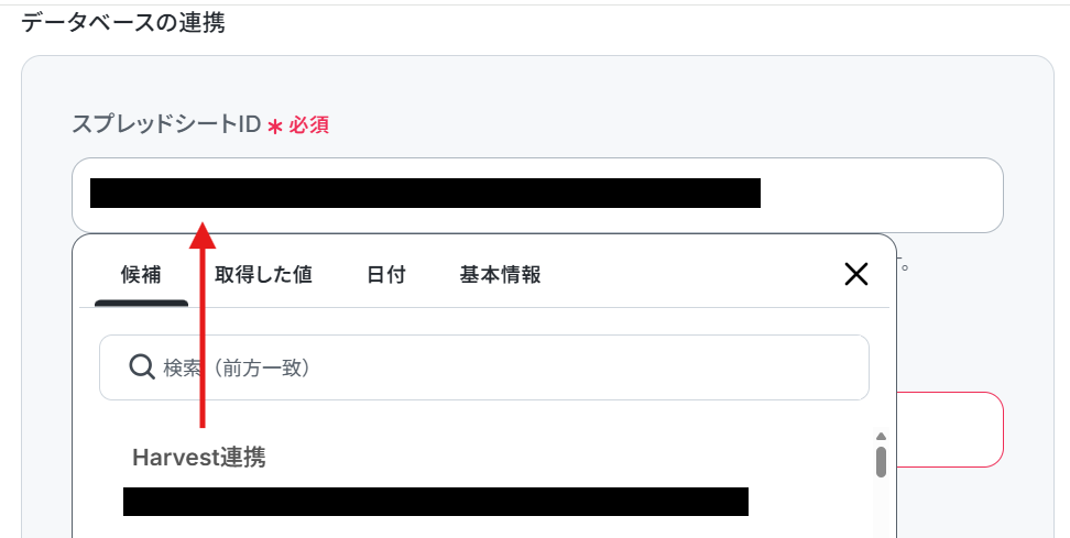スプレッドシートIDは、入力欄をクリックし、表示された候補の中から、事前準備で作成したGoogle スプレッドシート選択しましょう。