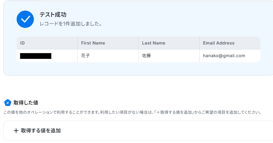 テストに成功すると取得した値 が表示されるので確認してください。 この取得した値は、次のステップで活用可能です。 内容を確認したら「完了」ボタンをクリックしましょう。 ※テストの重要性:「取得した値」のテスト値について も併せてご確認ください。