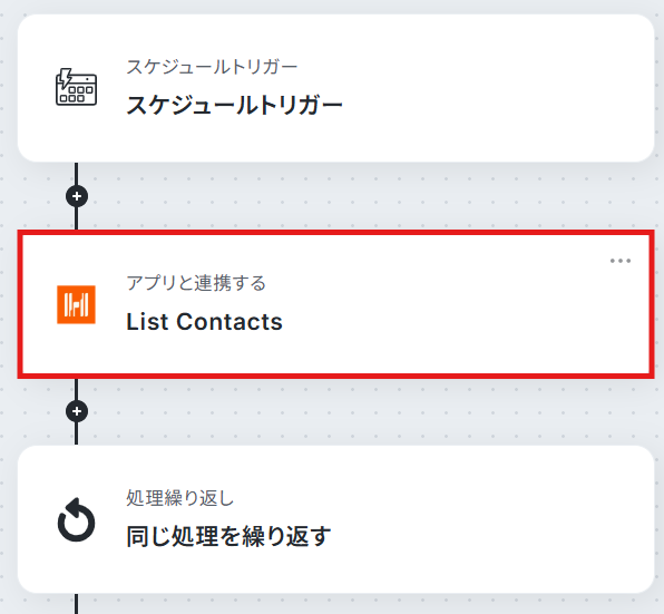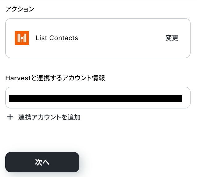 ステップ4:Harvestの連絡先を取得するアクションの設定 続いて、「List Contacts」という項目をクリックし設定していきましょう。