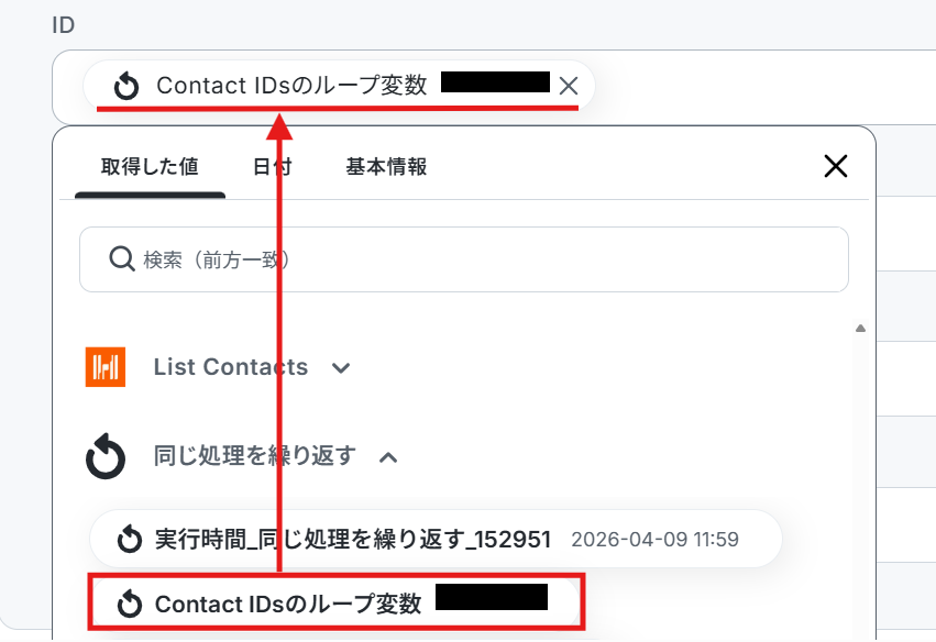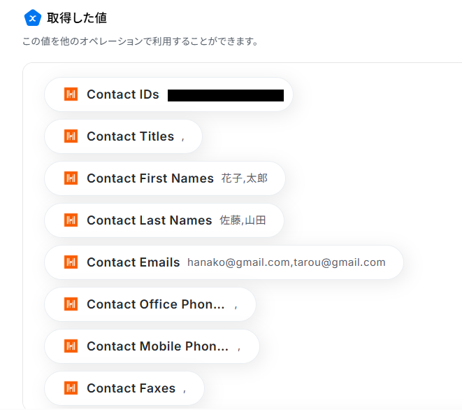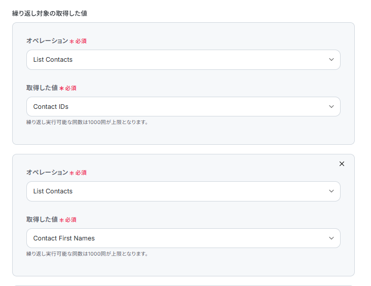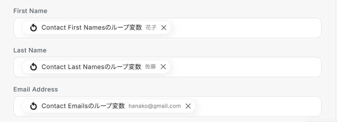 同じ処理を繰り返すアクションでは、ステップ4で複数取得したデータをそれぞれ個別に扱えるように処理します。 デフォルトでステップ4で取得した「Contact IDs」「Contact First Names」「Contact Last Names」「Contact Emails」が設定されているので確認しましょう。 確認できたら「完了」ボタンをクリックしてください。