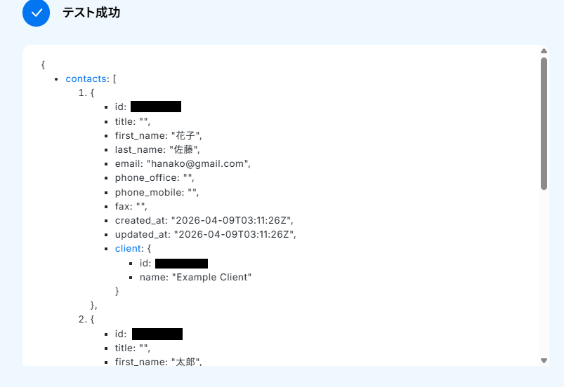 Harvestで連絡先を作成するアクションでは、どの項目にどの情報を登録するかを設定する必要があります。Copperから取得した担当者の氏名やメールアドレスなどの値を、Harvestの対応する項目にそれぞれ正しくマッピングしてください ■注意事項