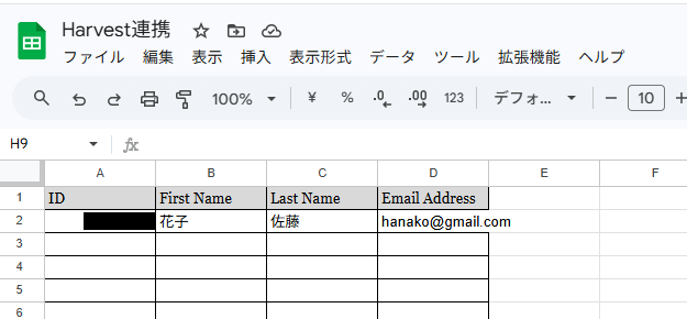 ≪事前準備≫ 今回の連携に使用するためのGoogle スプレッドシートを用意しましょう! 例として、「ID」「First Names」「Last Names」「Emails」をまとめたリストを作成しました。