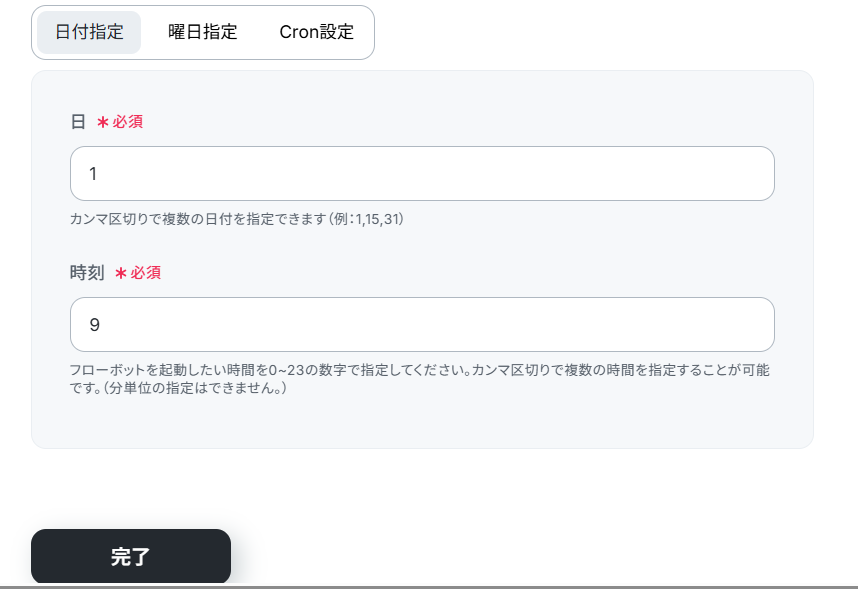 スケジュール設定をおこないます。 起動スケジュールは日付指定、曜日指定、Cron設定の中から選択可能です。 デフォルトの設定では日付指定を使用し、毎月1日の午前9時に起動するように設定してあります。 用途に合わせて変更し使用してください。 設定が完了したら「完了」ボタンをクリックしましょう。 ※詳しい設定方法は、以下のリンク先をご覧ください。
