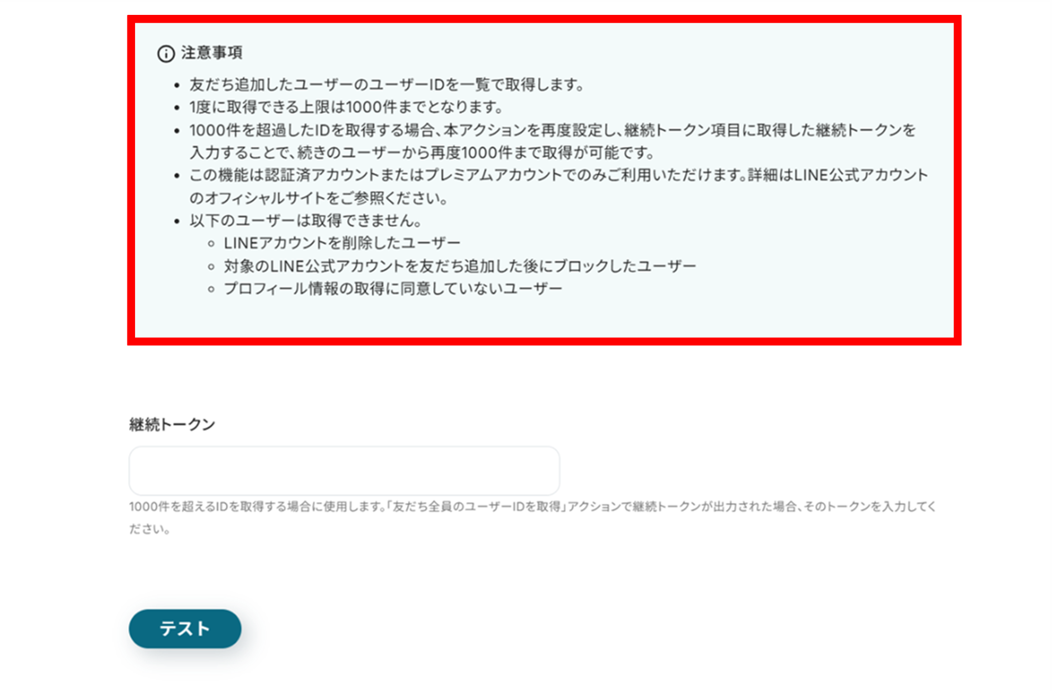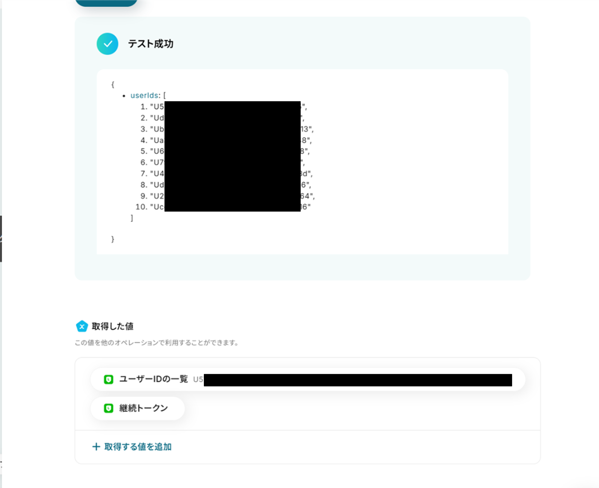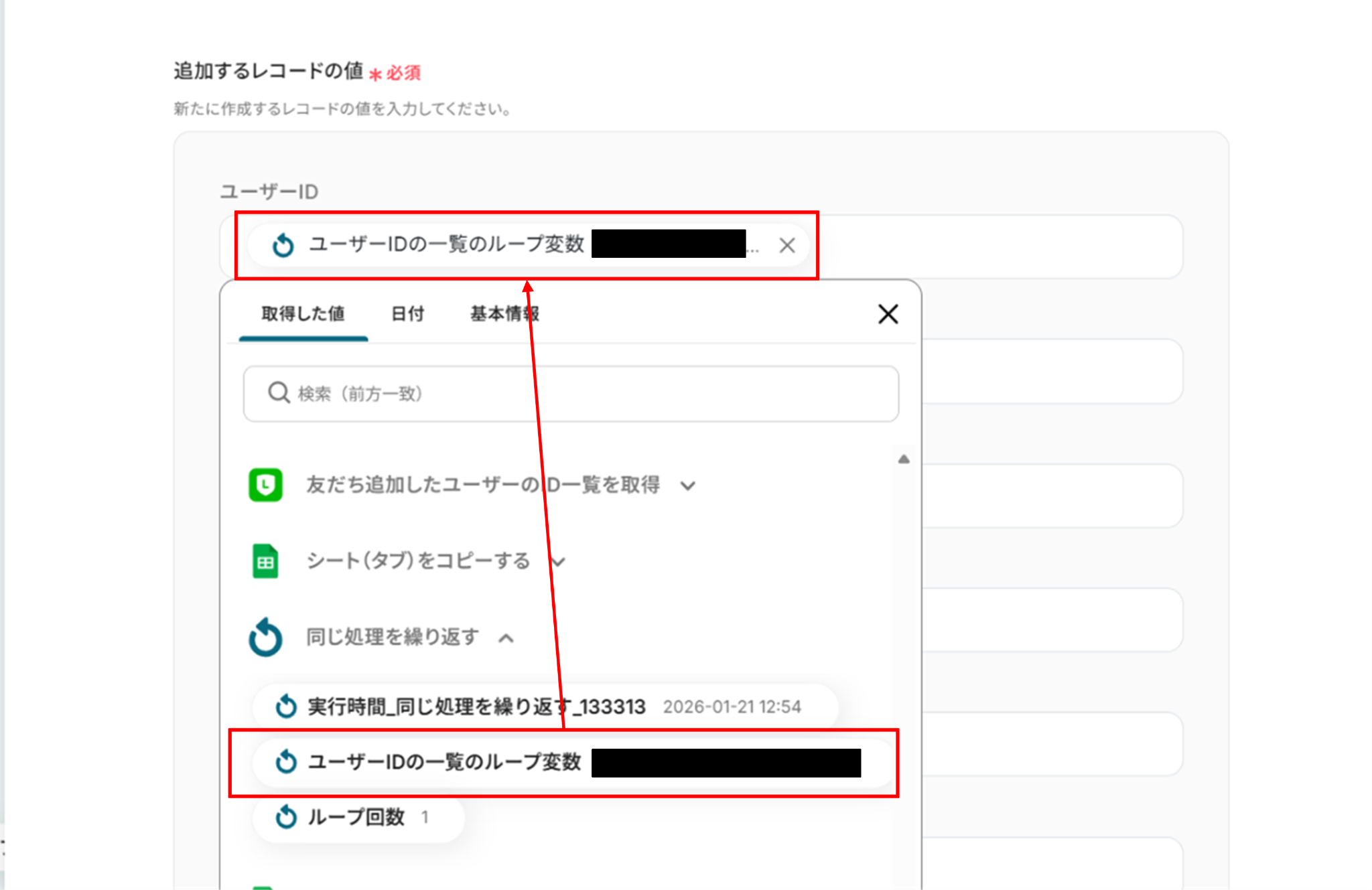 (3)ユーザーIDに取得した値を使って「ユーザーIDの一覧のループ変数」を選択します。 入力が終わったら「テスト」をクリックしましょう!