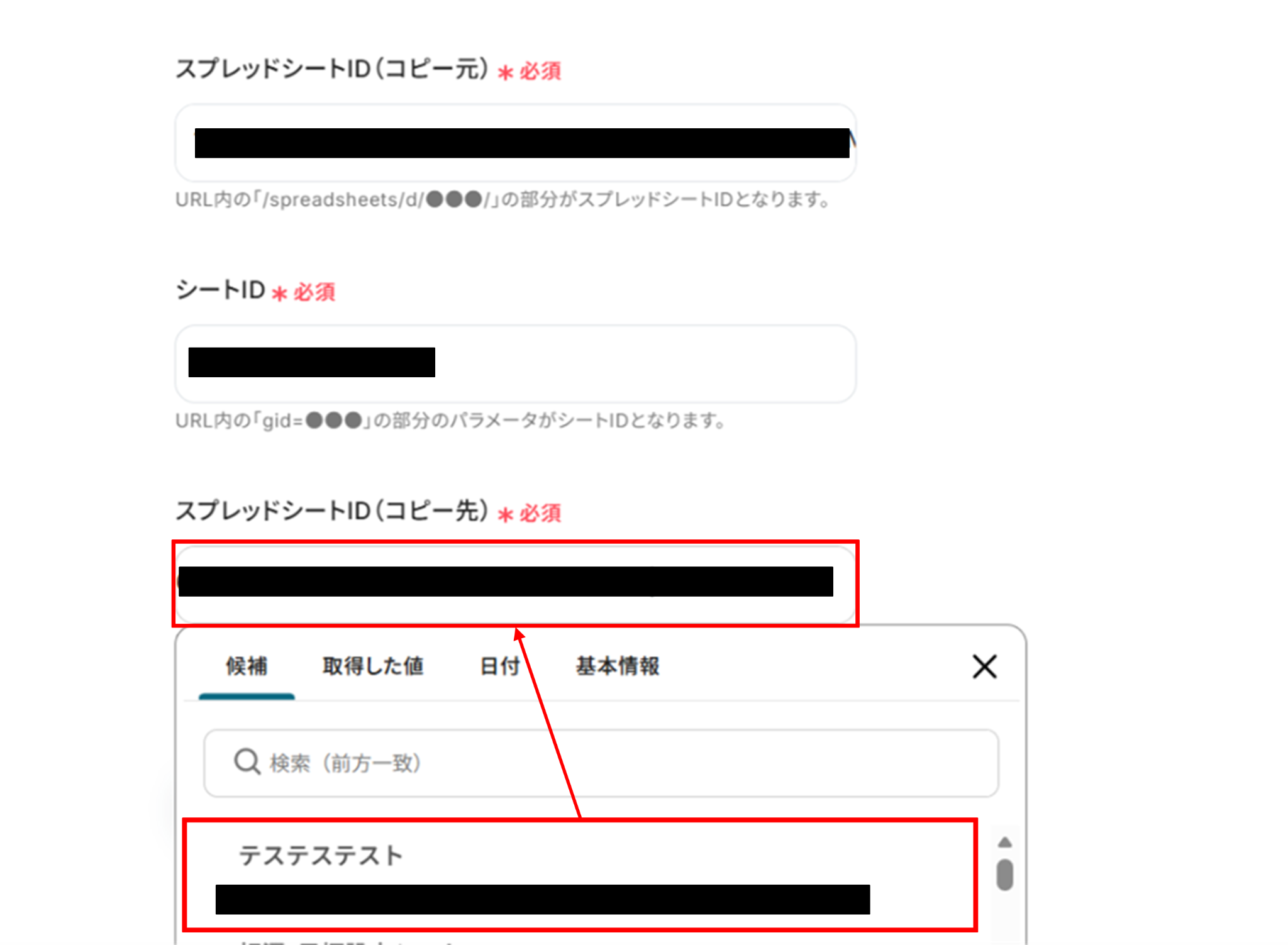 スプレッドシートID(コピー先):コピーしたシートを移動先を選択