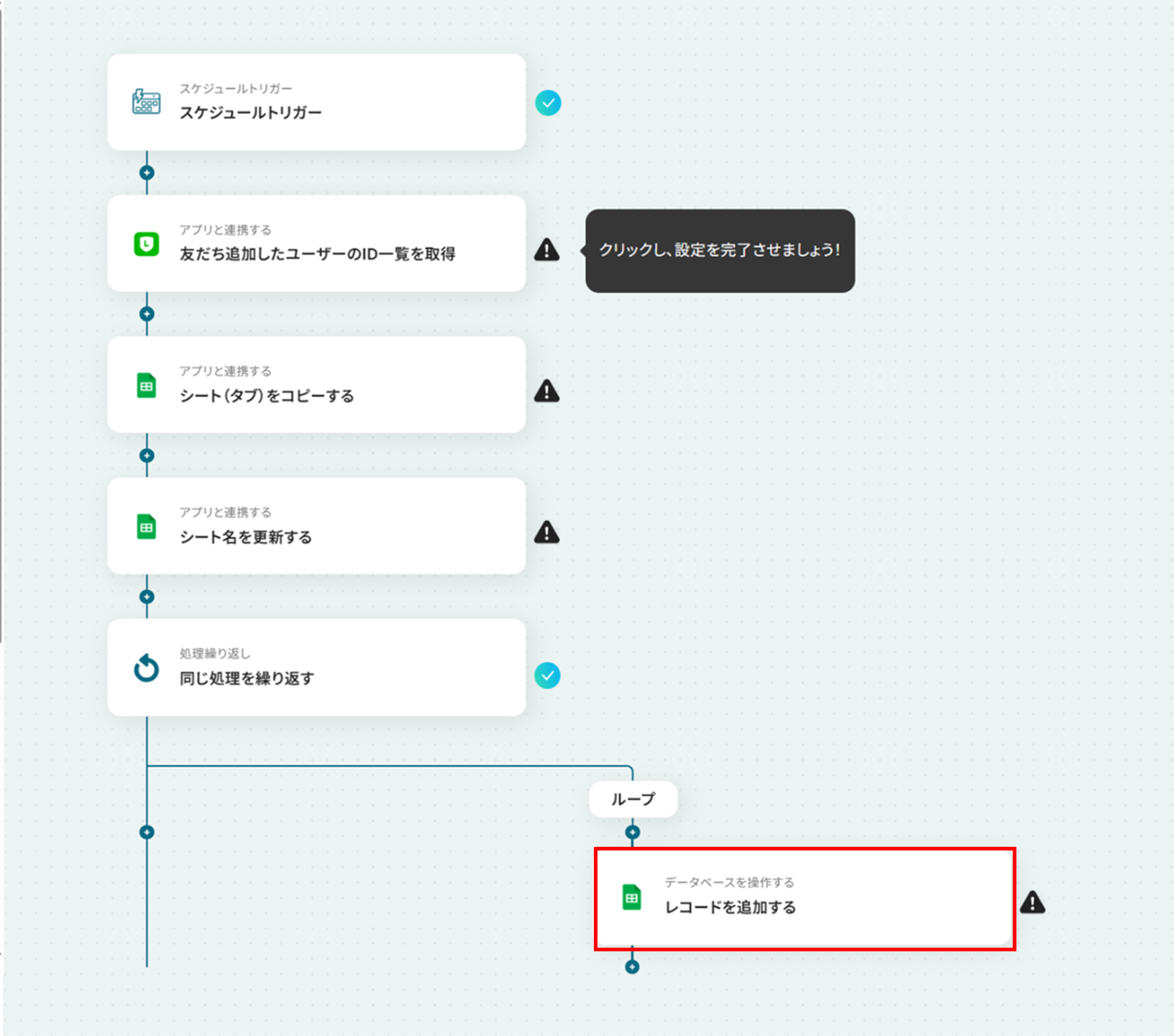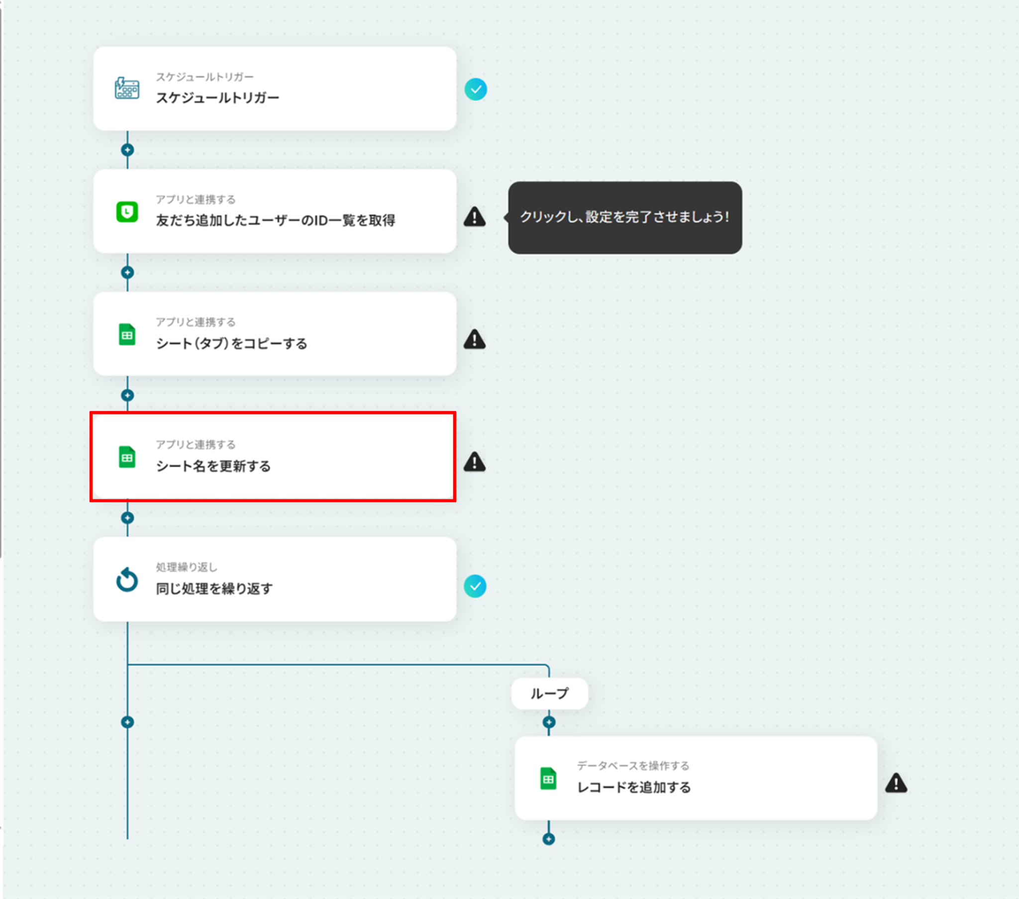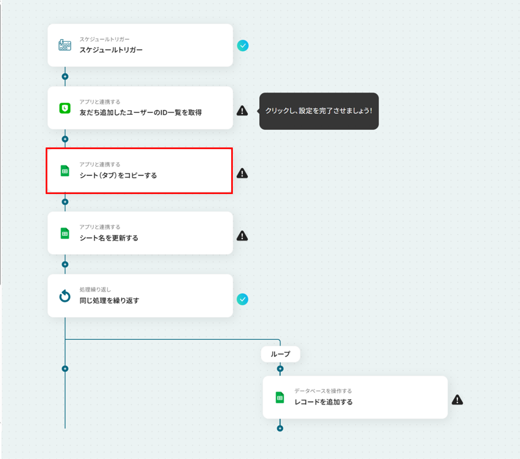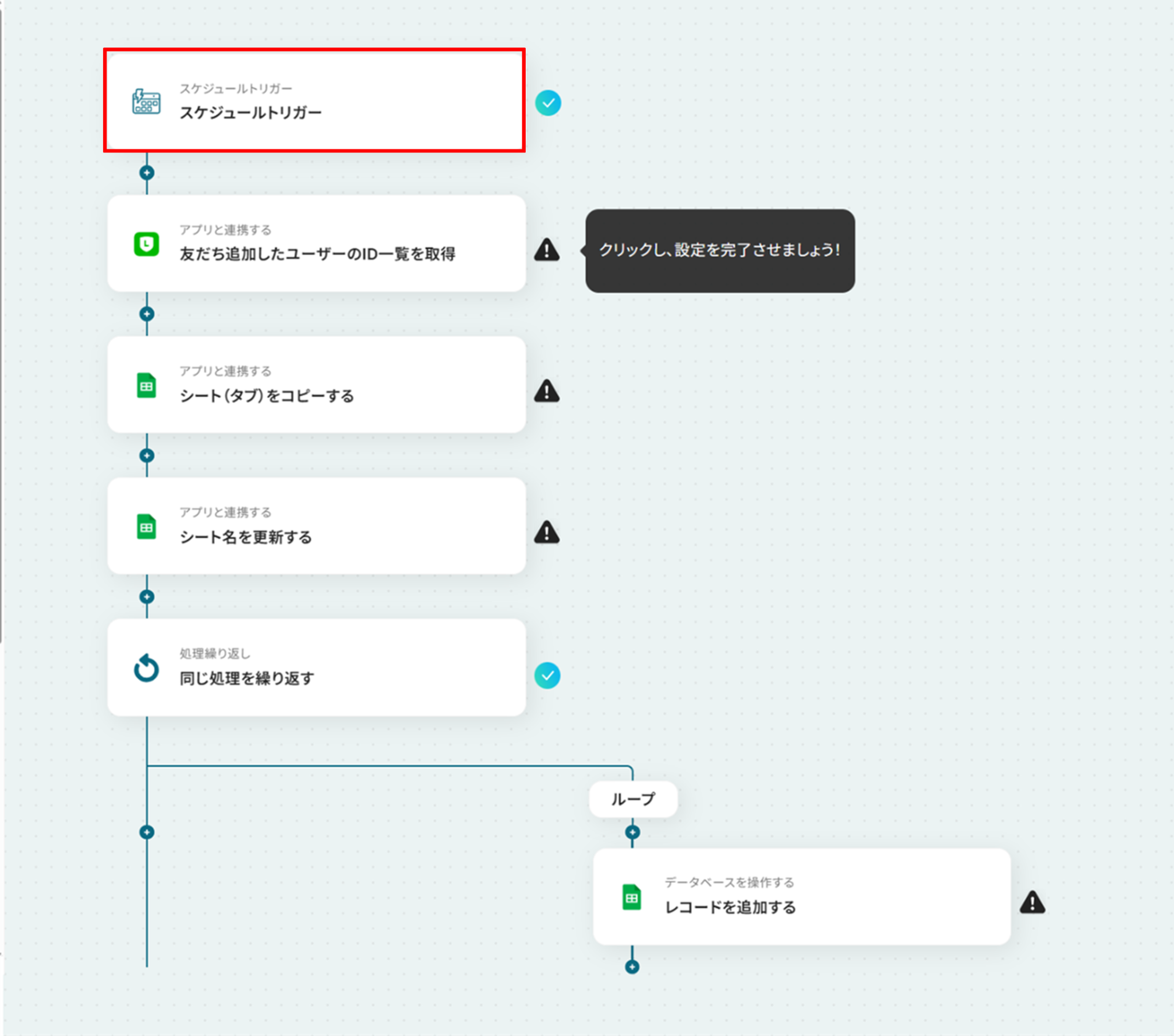 スケジュールトリガーの設定では、フローボットを実行したい頻度(毎日、毎週、毎月など)や日時を任意で設定してください 繰り返し処理の設定では、LINE公式アカウントから取得した友だちIDの一覧が、繰り返し対象として正しく設定されているかを確認してください Google スプレッドシートの各アクションでは、出力先となる任意のスプレッドシートIDや、コピー元となるシート名などを設定してください ■注意事項