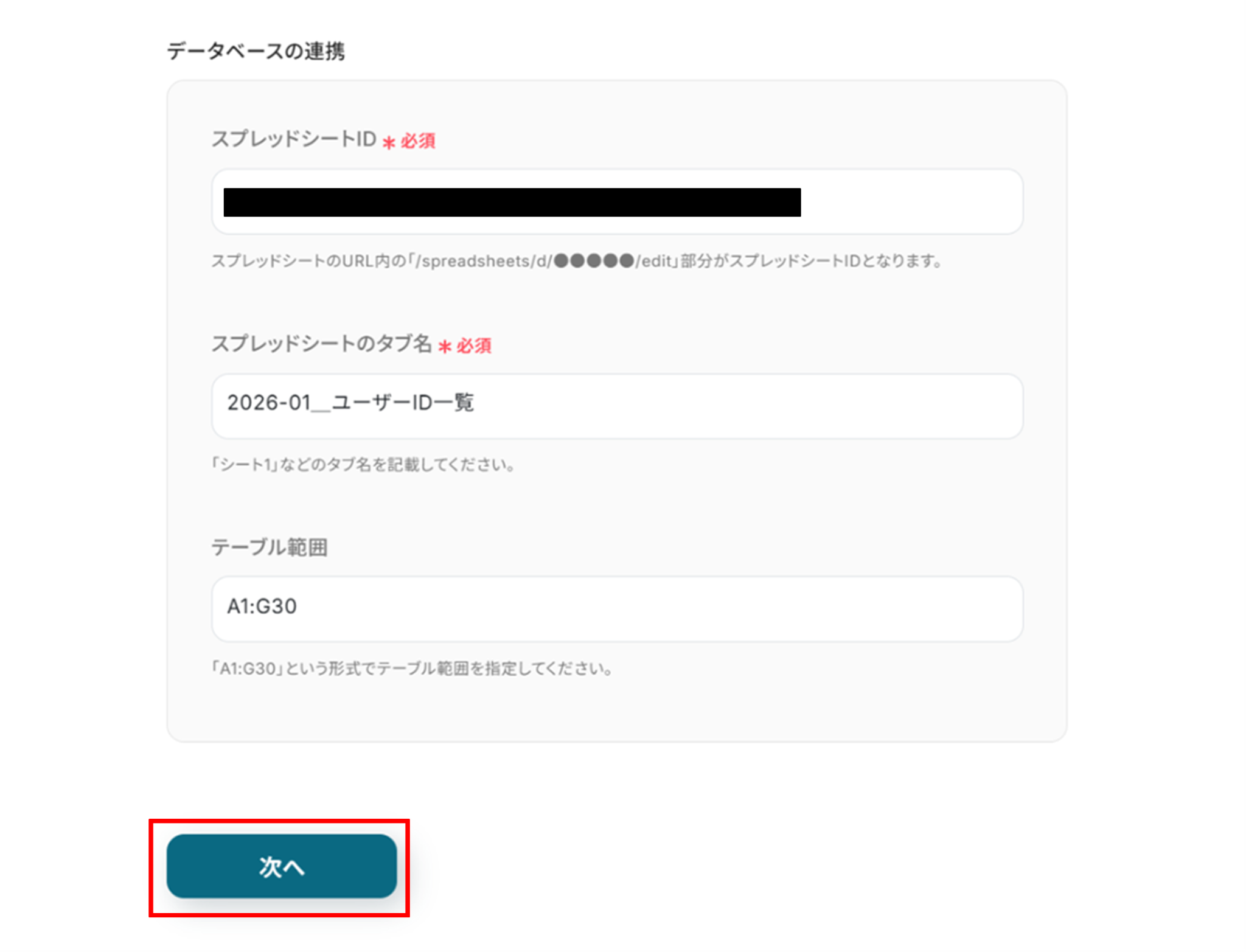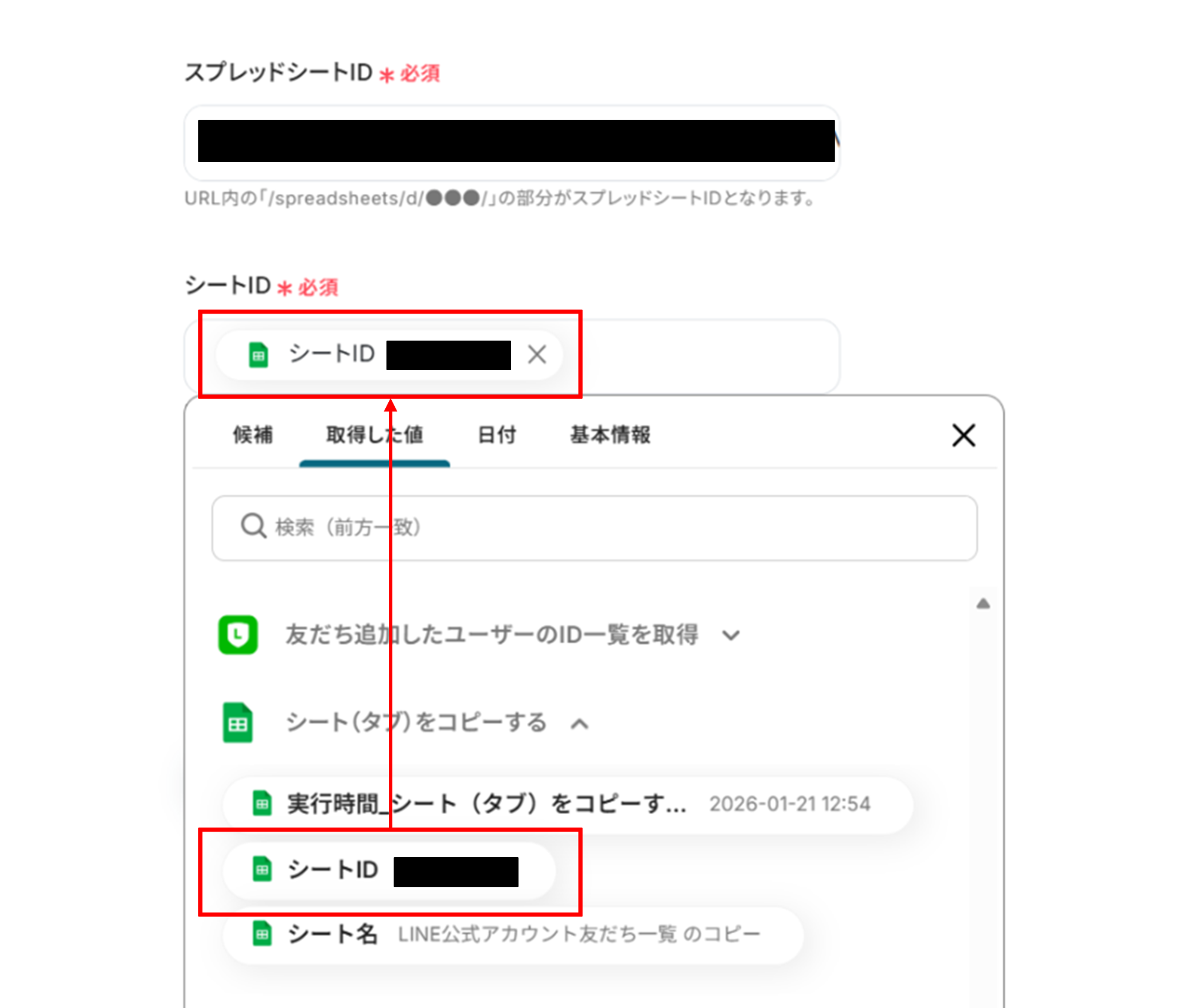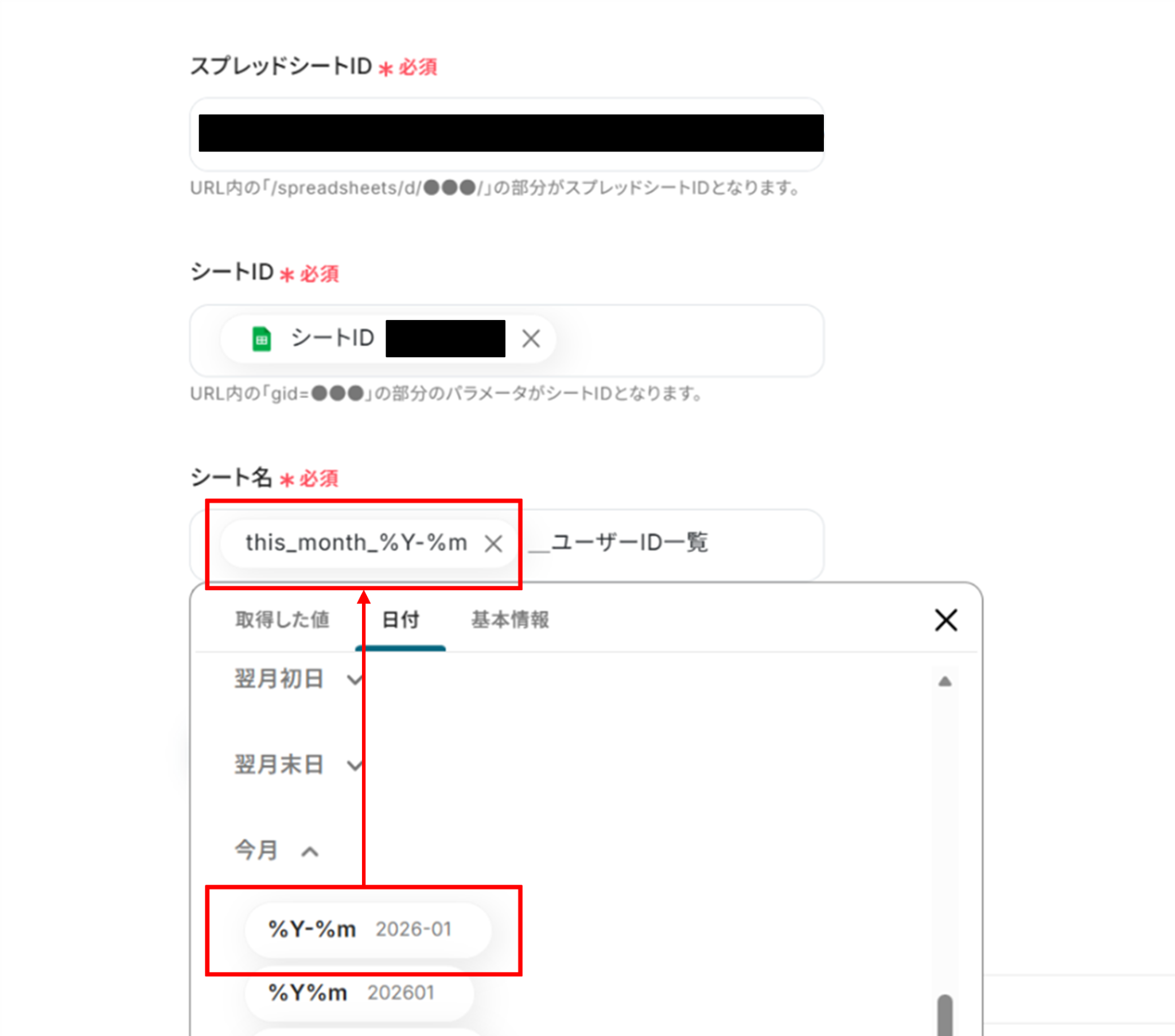 (3)スプレッドIDは候補から選択します。 シートIDは取得した値を使って入力します。 取得した値を使うことで、都度変更することなく最新の情報を反映することができます!