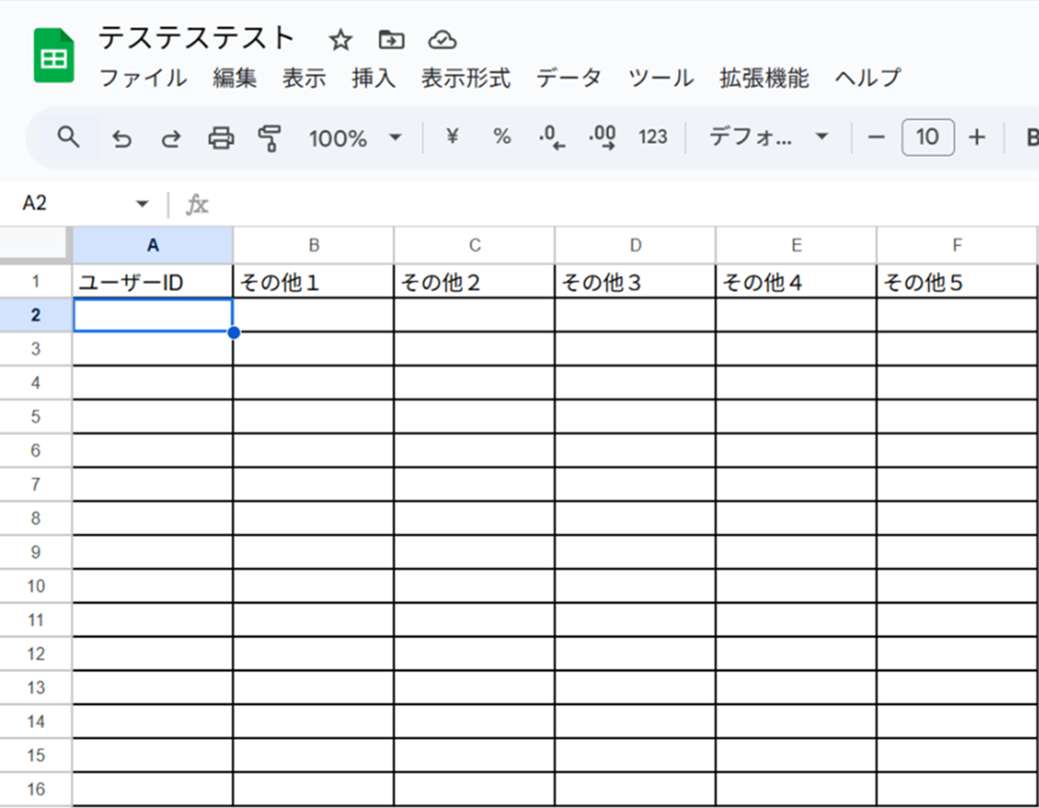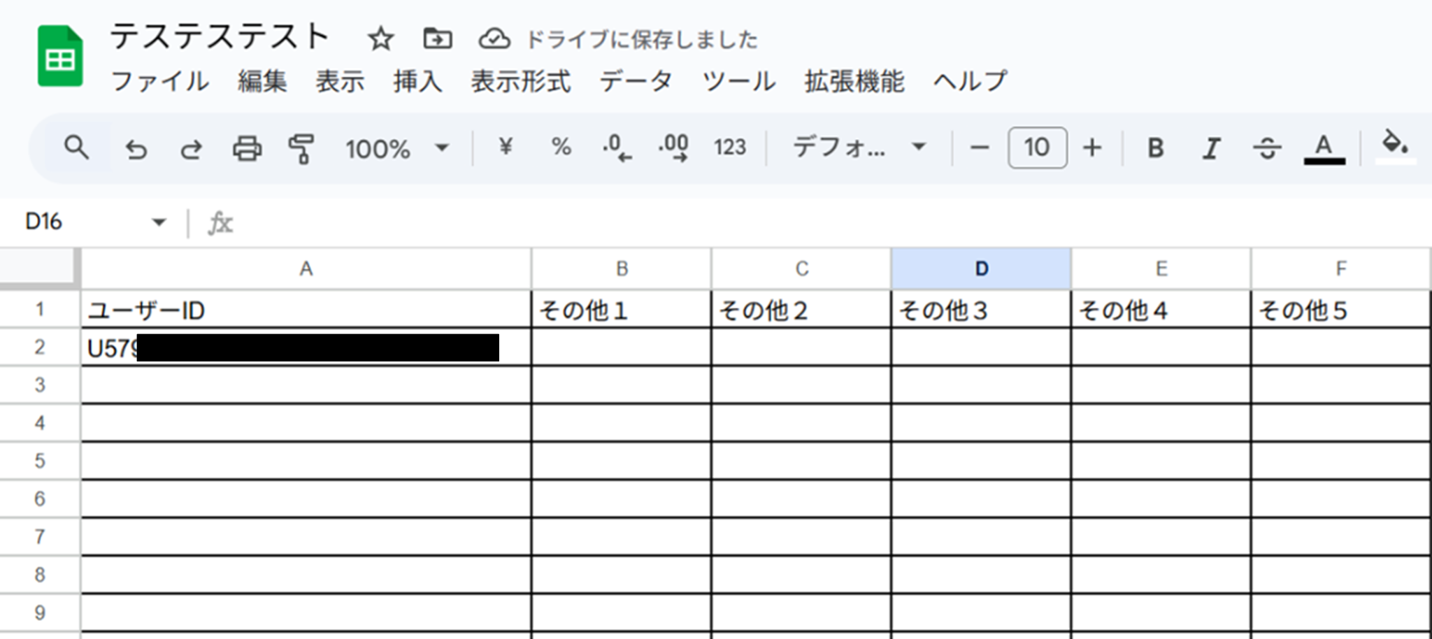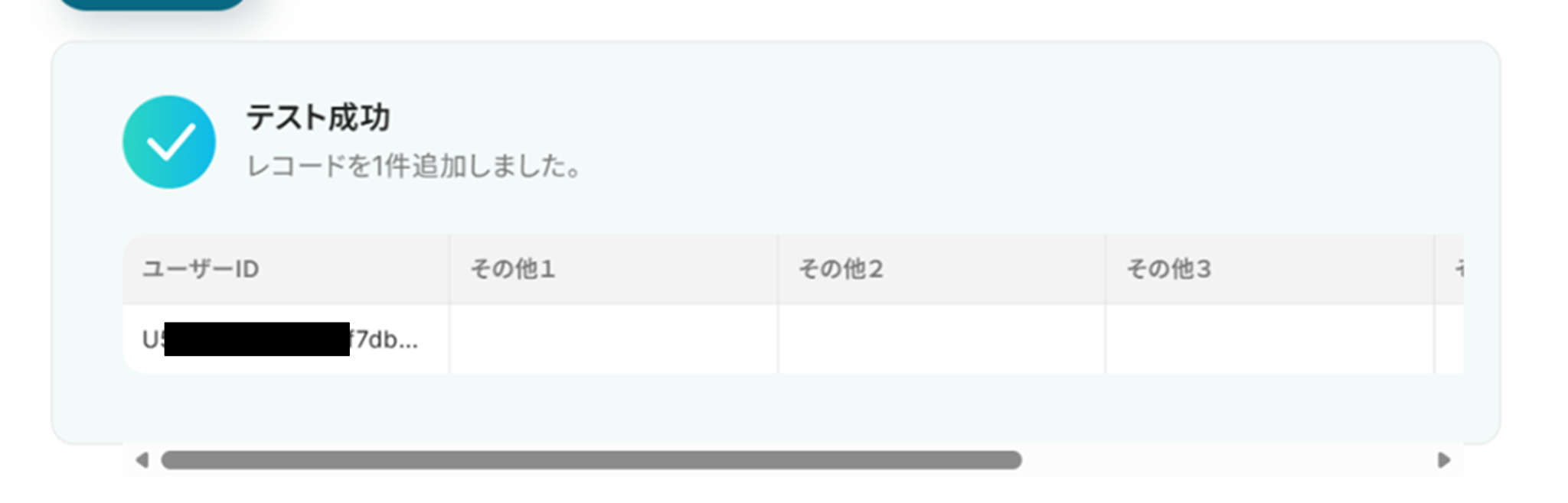 テストに成功すると、Google スプレッドシートにLINE公式アカウントのユーザーIDが反映されていました! ※テスト時は対象が複数ある場合でも最初の1件目がGoogle スプレッドシートに反映されます。 Yoomに戻って「完了」をクリックしましょう。