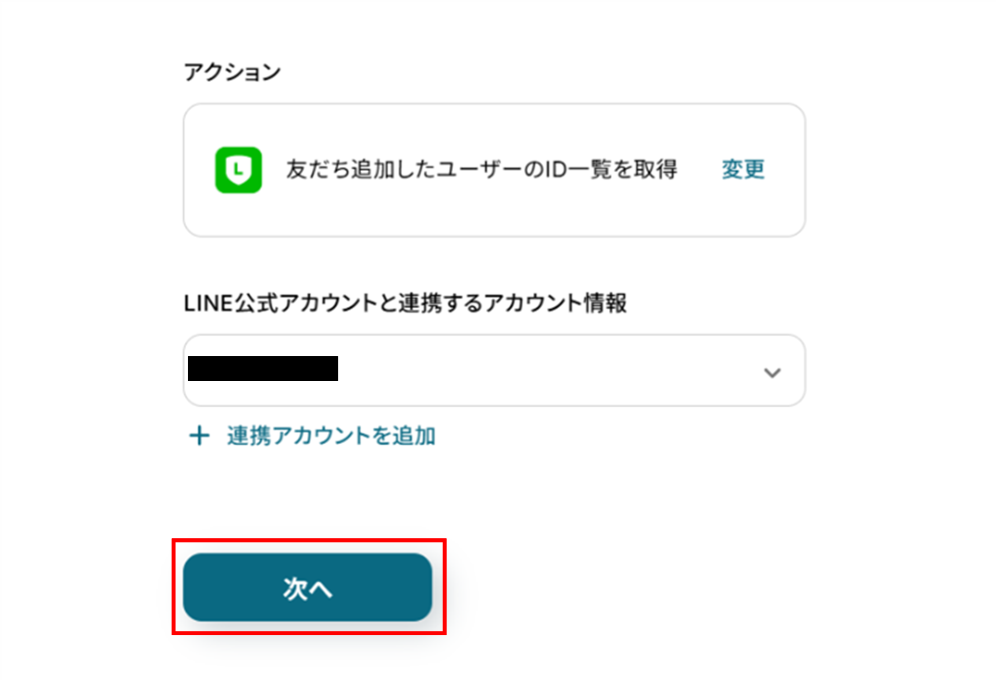 (2)「連携アカウントとアクションを選択」画面から、LINE公式アカウントと連携するアカウント情報に誤りがないかを確認し、アクションは「友だち追加したユーザーのID一覧を取得」のままで「次へ」をクリックします。