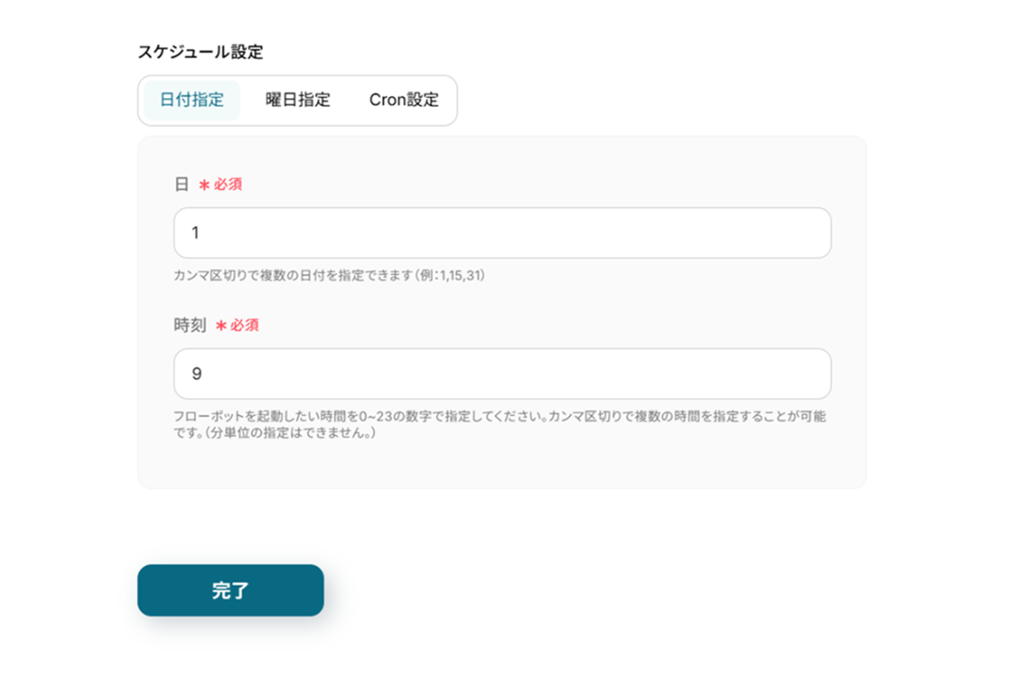 下の画像では毎月9時に起動するように設定しました! 入力が終わったら「完了」をクリックしましょう。