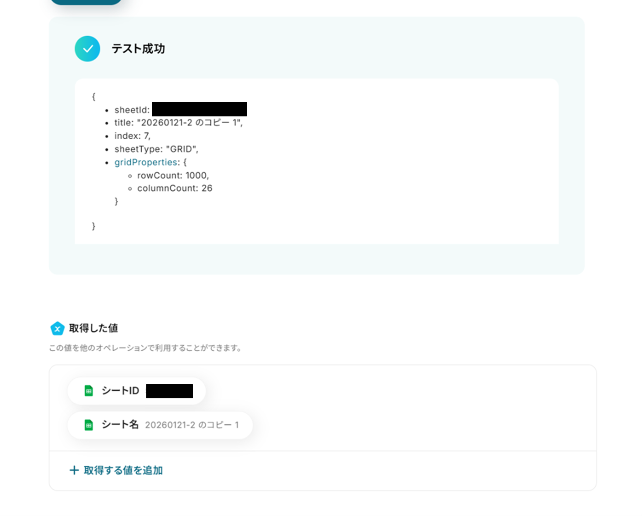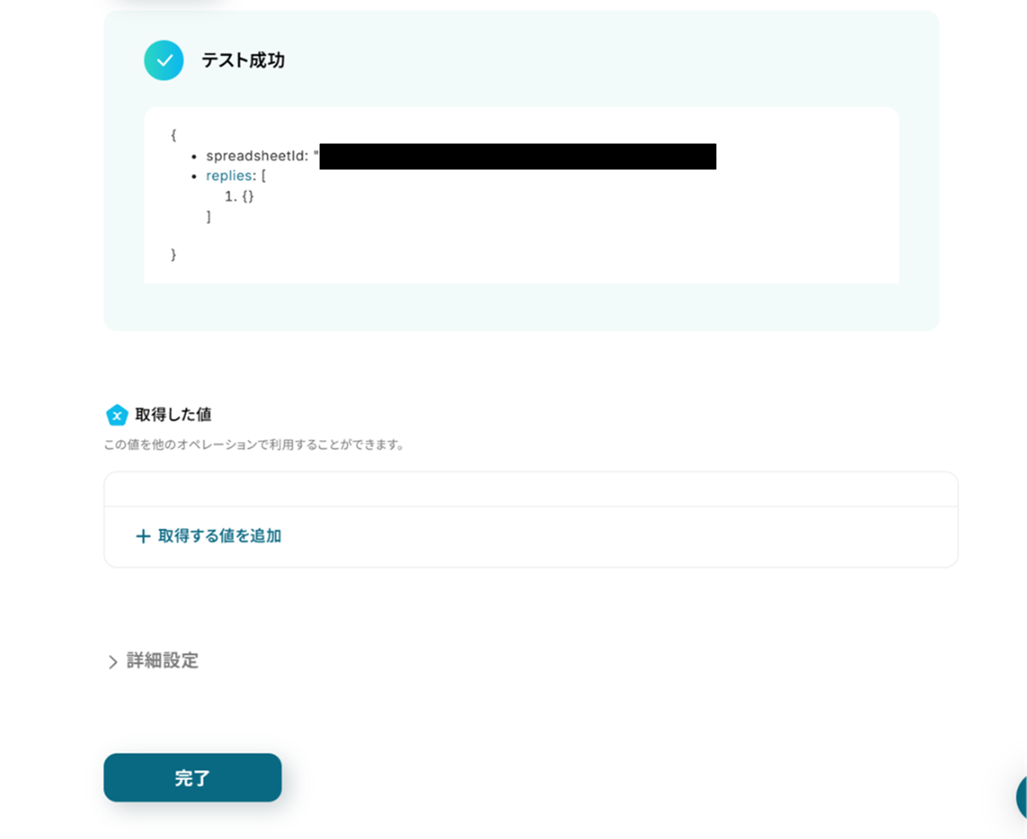 テストに成功しました! テストに成功すると、指定したGoogle スプレッドシートにシートのコピーが作成されます。 「完了」をクリックして次の工程へ進みましょう!