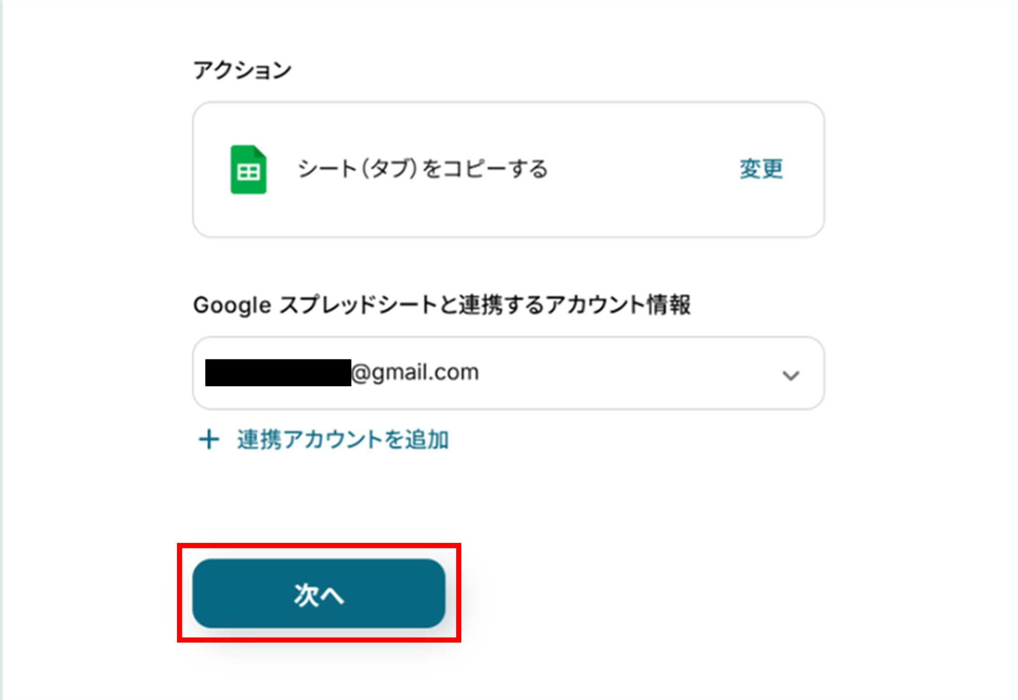 (2)「連携アカウントとアクションを選択」画面から、Google スプレッドシートと連携するアカウント情報に誤りがないかを確認し、アクションは「シート(タブ)をコピーする」のままで「次へ」をクリックします。