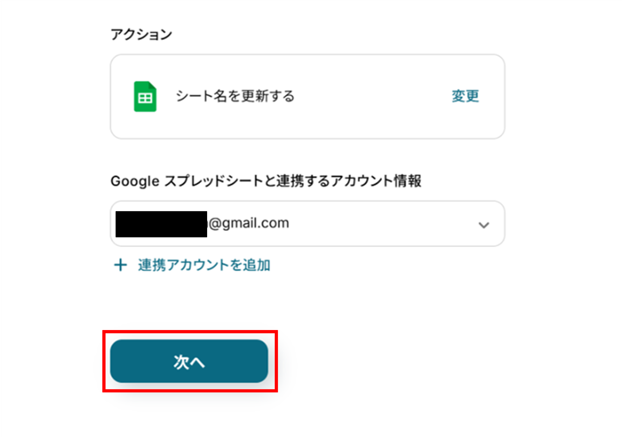 (2)「連携アカウントとアクションを選択」画面から、Google スプレッドシートと連携するアカウント情報に誤りがないかを確認し、アクションは「シート名を更新する」のままで「次へ」をクリックします。