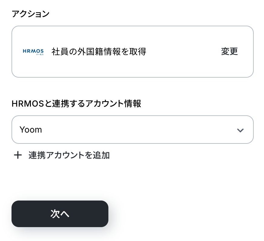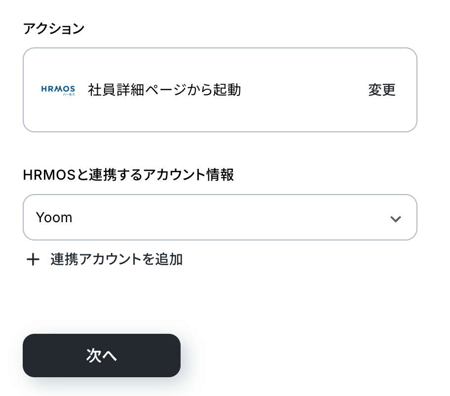 アクションの設定内容を確認し、HRMOSと連携しているアカウント情報にも問題がないか確認したら「次へ」をクリックします。