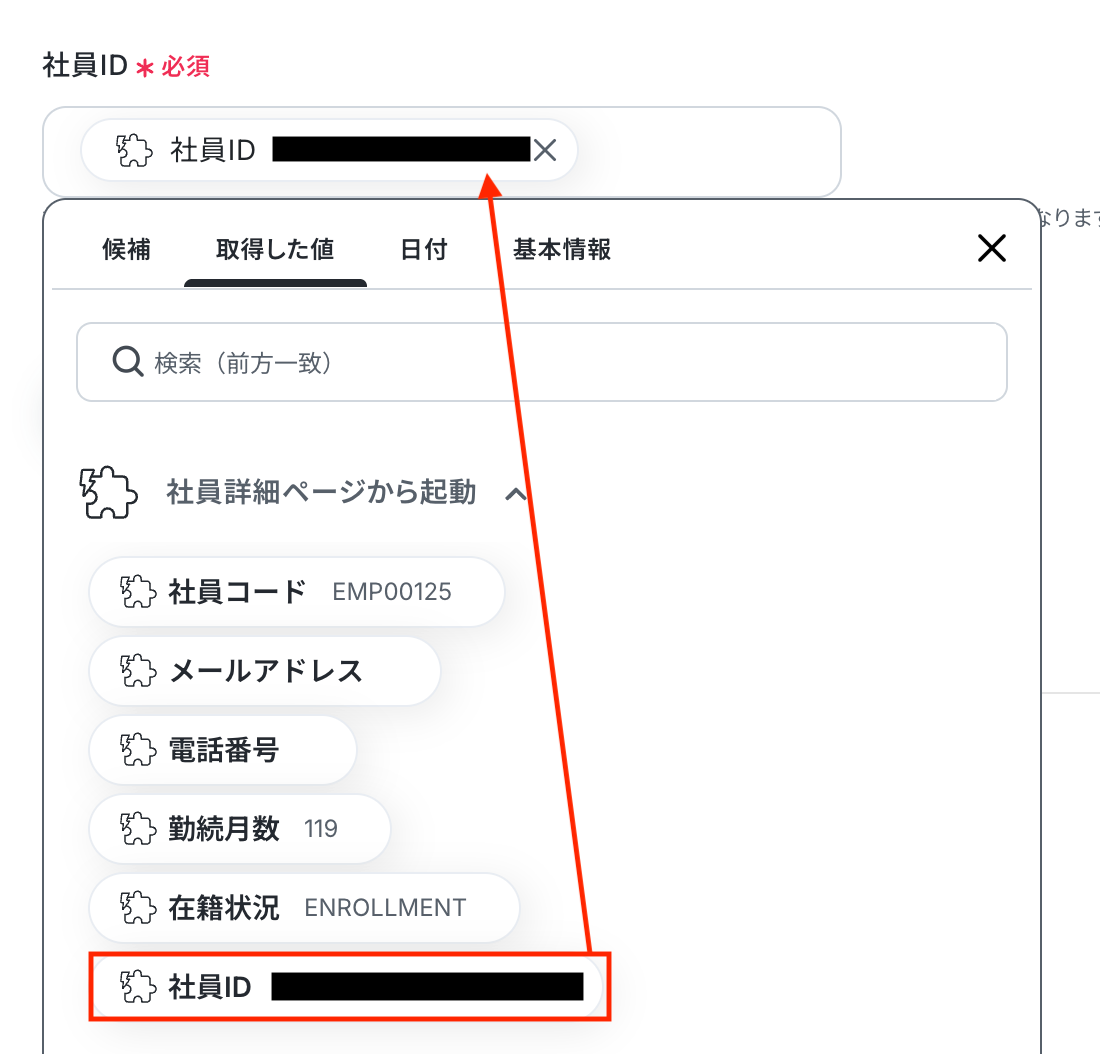 入力欄をクリックすると、前のステップでHRMOSから取得した値が表示されるので、選択して入力しましょう。