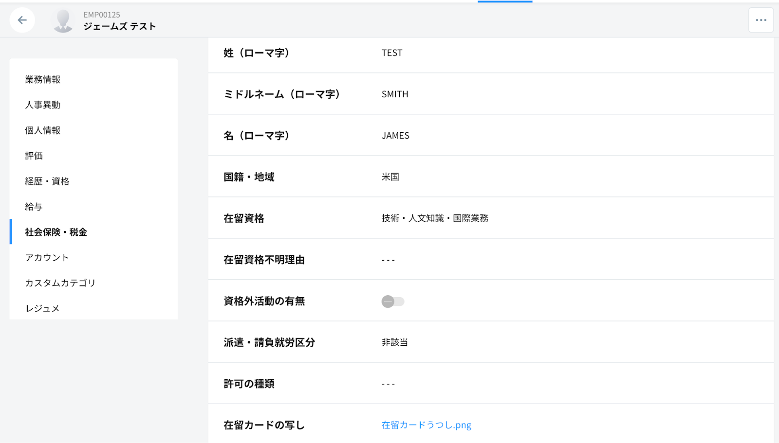 テストに成功すると、社員の外国籍情報が一覧で表示されます。