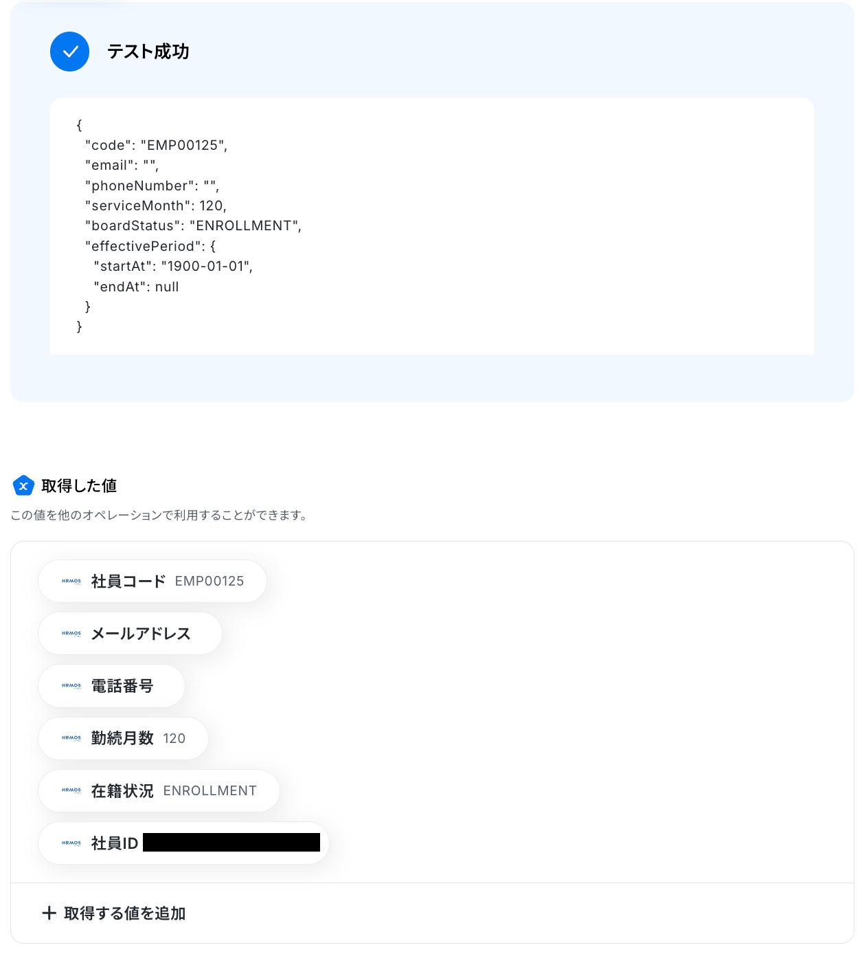 なお、テキストを直接入力した部分は固定値とされるため、取得した値を活用せず設定を行うと毎回同じデータがHRMOSから取得されてしまうので注意が必要です。