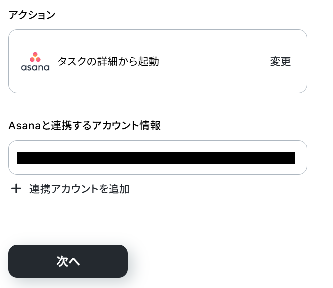 - 次に、トリガーでAsanaを選択し、「タスクの詳細から起動」アクションを設定します。これにより、Asanaの特定のタスクから手動でフローを起動できるようになります。