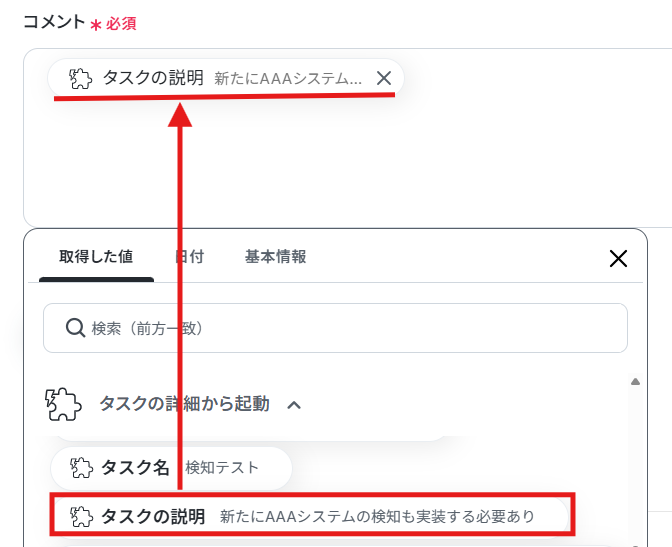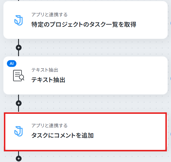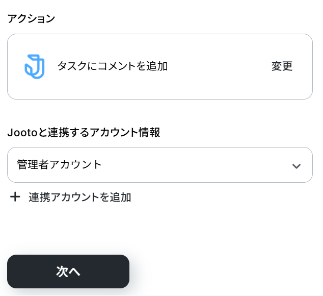 - 最後に、Jootoの「タスクにコメントを追加」アクションを設定し、前のステップで取得・抽出した情報を基に、該当タスクへコメントを投稿します。