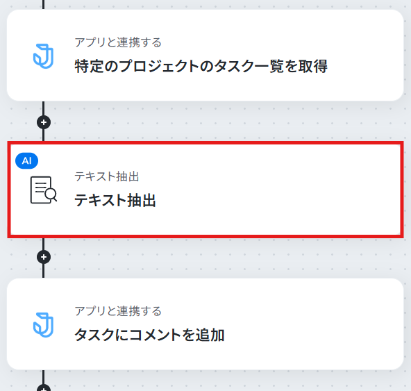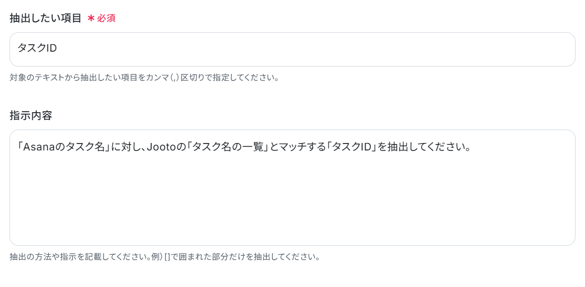 - AI機能のテキスト抽出では、Asanaのタスク詳細(タイトルや説明文など)を変数として利用し、Jootoに投稿したい内容を抽出するための指示を自由にカスタマイズできます。