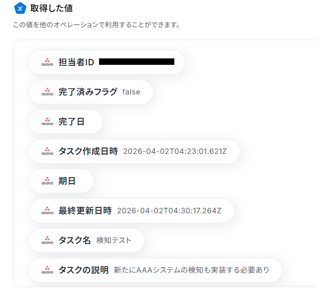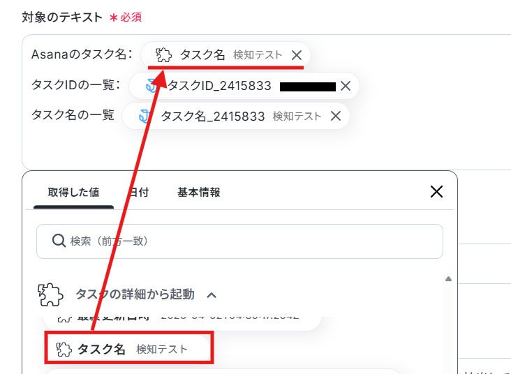 対象のテキストは、デフォルトでAsanaのタスクの「タスク名」とJootoのタスクの「テスクID」「タスク名」の取得した値が設定されているので確認し、設定はこのままにしましょう。