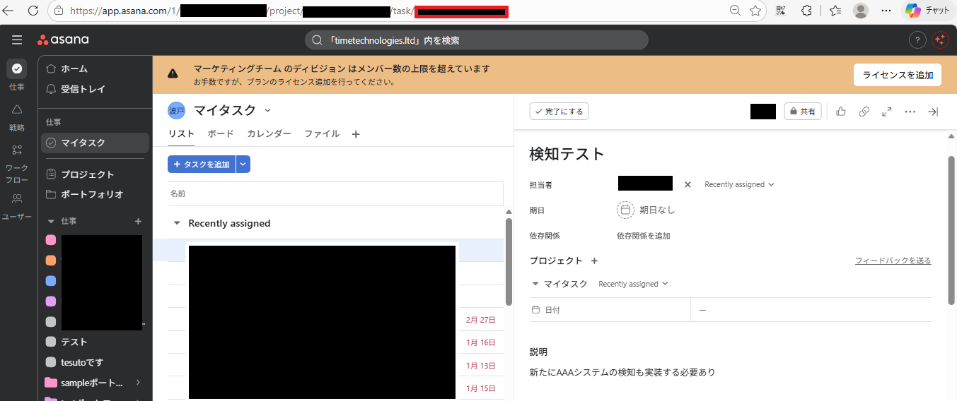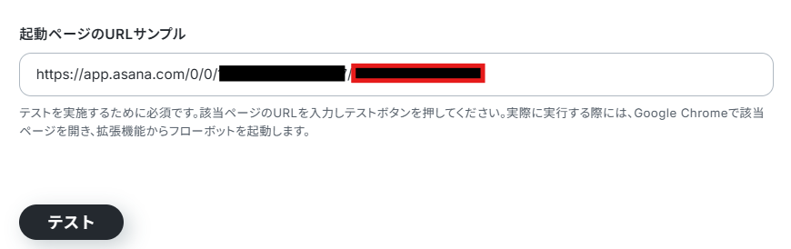 続いて、起動ページのURLサンプルを設定するため、Asanaにログインし事前準備で作成したテスト用のタスクの詳細画面を開いてください。