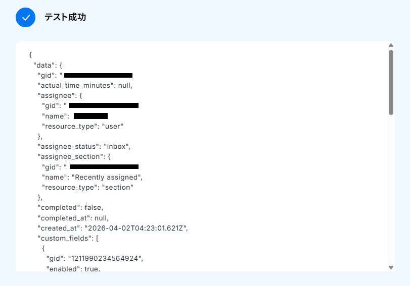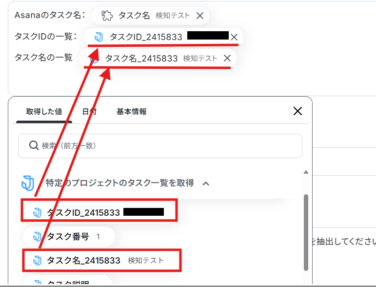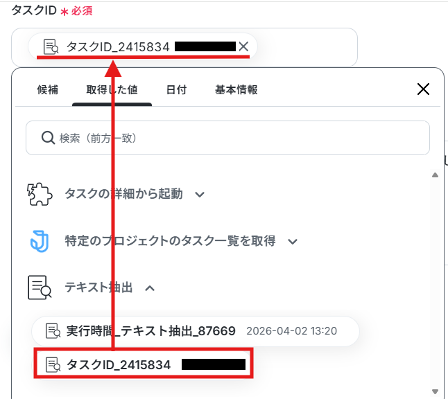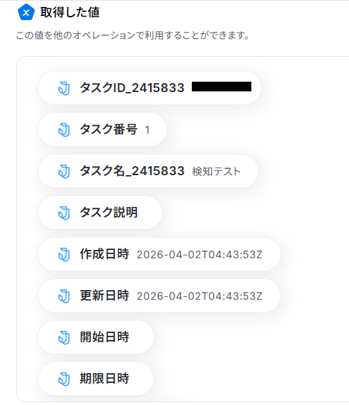 抽出したい項目は、「タスクID」を抽出できるように設定してあります。