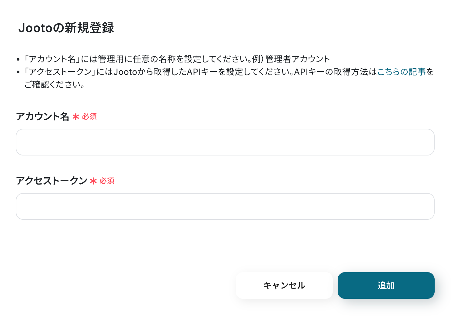注釈を確認し、「アカウント名」と「アクセストークン」を入力してください。