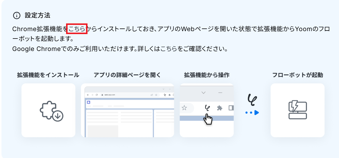 初めに、設定方法に記載されている「こちら」をクリックし、Chrome拡張機能をインストールしてください。