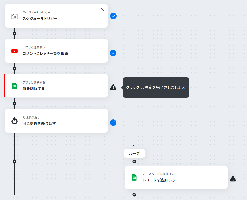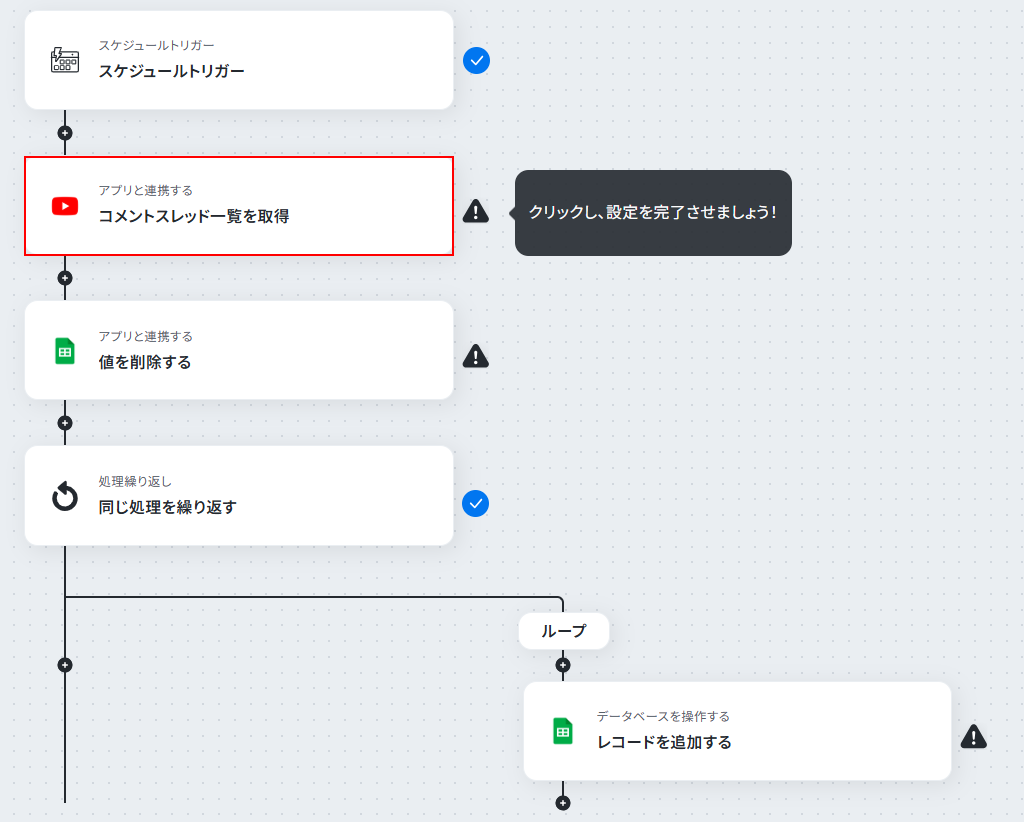 それではここから代表的な例として、定期的にYouTubeの動画からコメント一覧を取得し、Google スプレッドシートに自動で記録するフローを解説していきます!