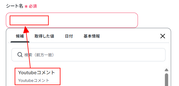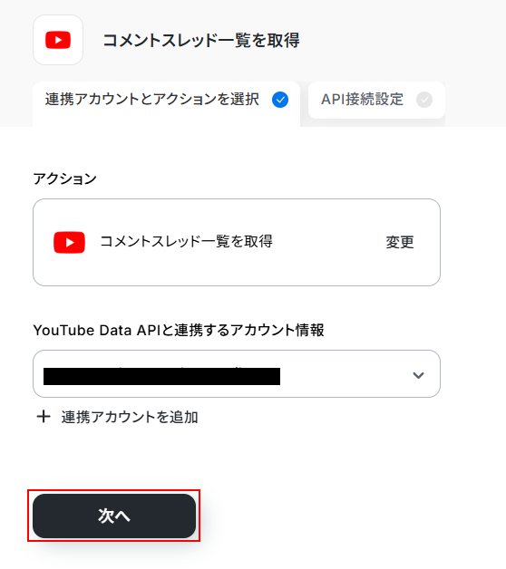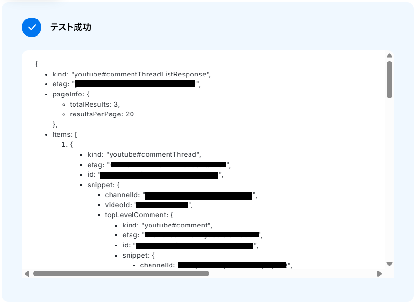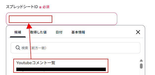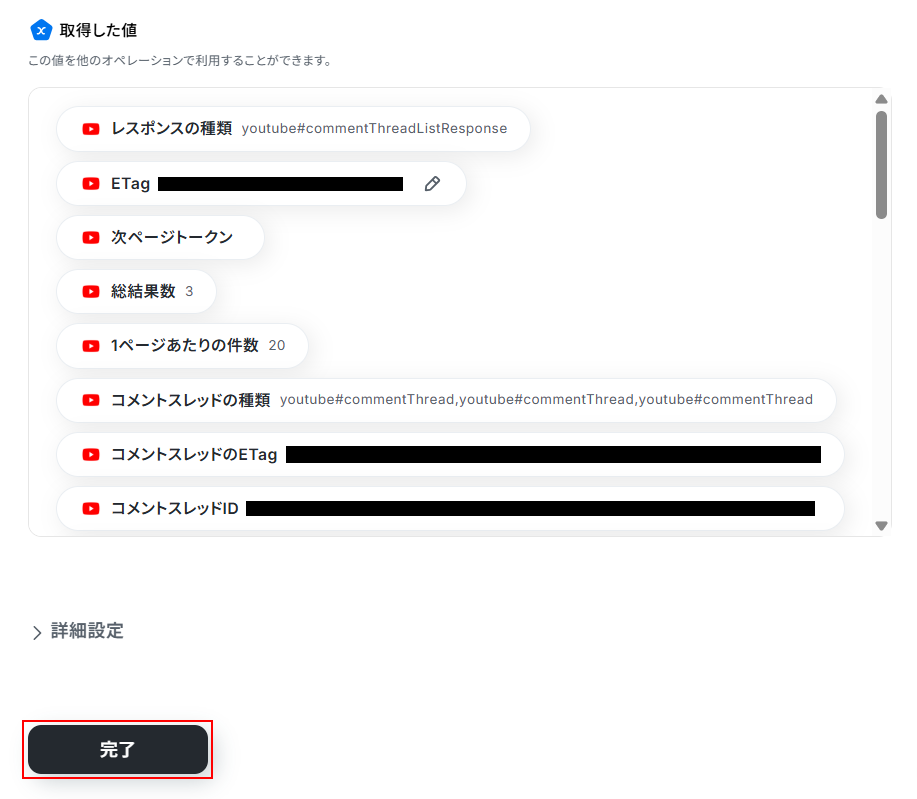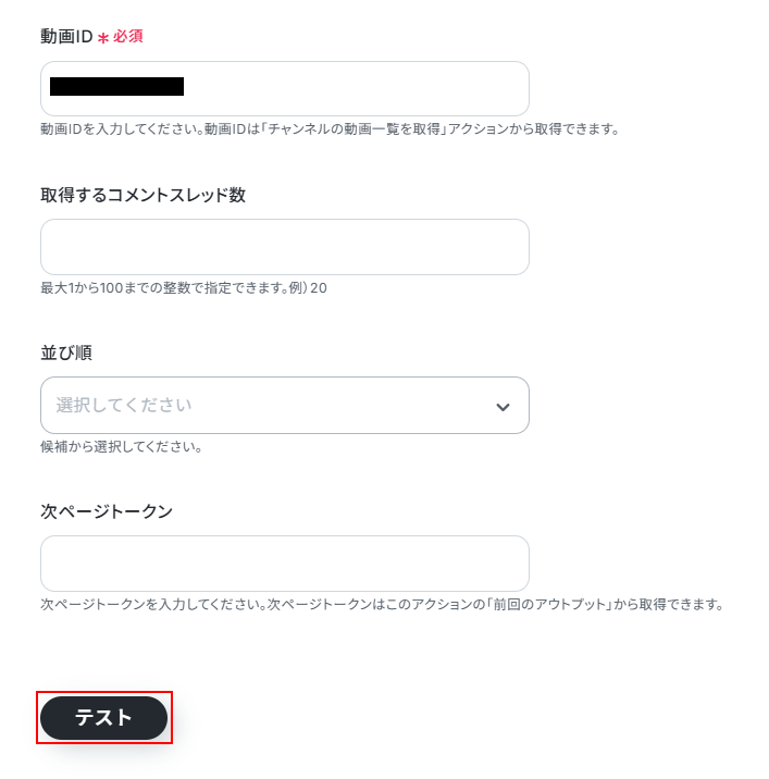 - YouTube Data APIの「コメントスレッド一覧を取得」アクションでは、対象としたい動画のIDを任意で設定してください