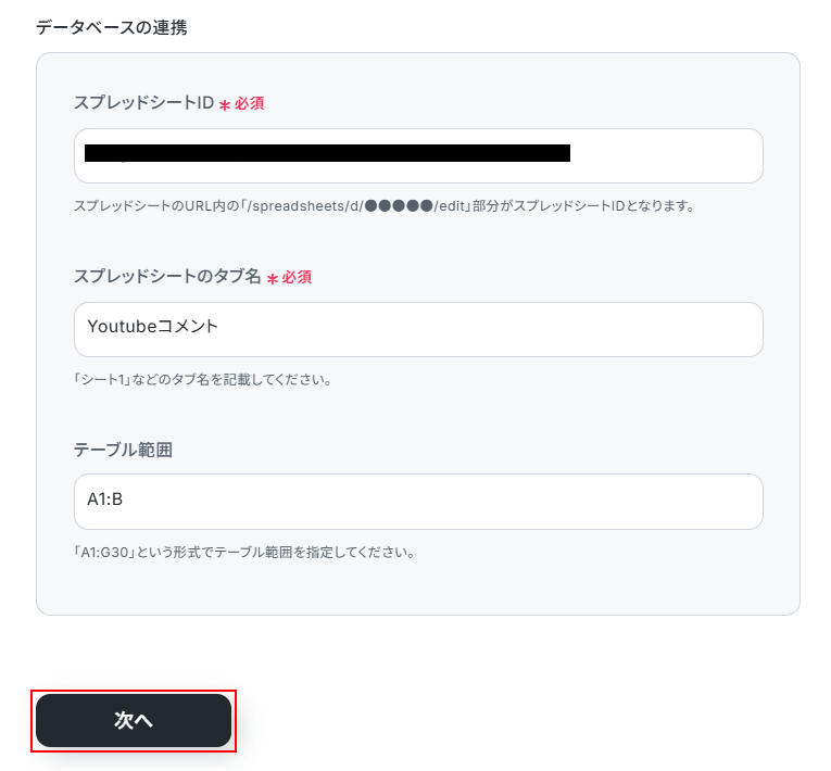 - Google スプレッドシートの各アクションでは、コメントを記録したい任意のスプレッドシートIDとシート名を設定してください