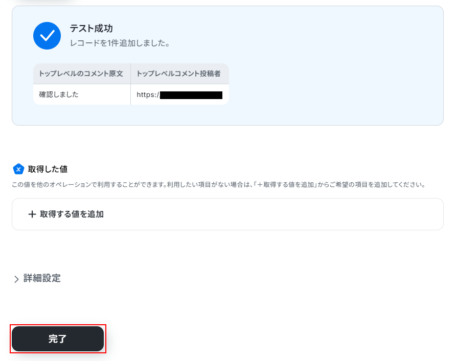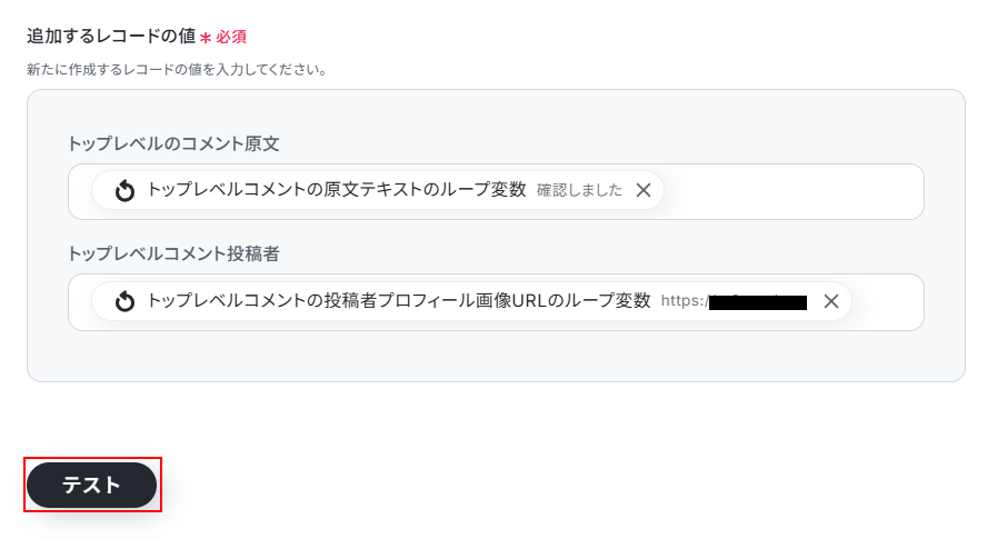 - 最後に、オペレーションでGoogle スプレッドシートの「レコードを追加する」アクションを設定し、取得したコメントをスプレッドシートに一行ずつ追加します
