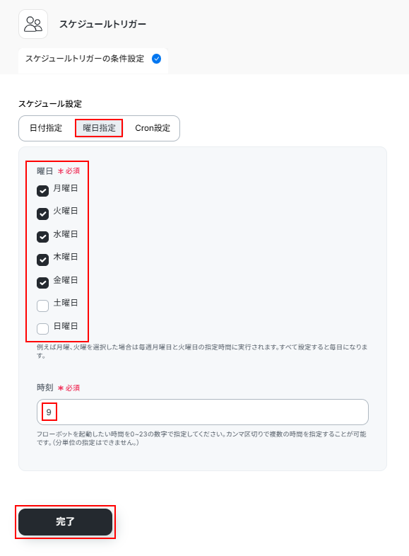 今回はデフォルトで設定されている曜日指定を使用し、毎週月曜日から金曜日の朝9時に起動するように設定しました。