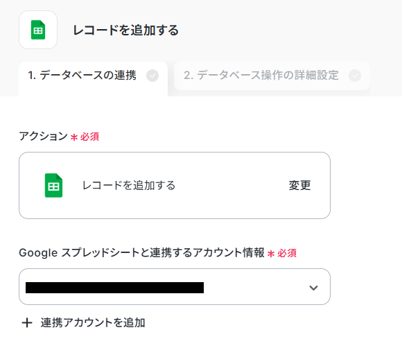 - 最後に、繰り返し処理の中でGoogle スプレッドシートの「レコードを追加する」アクションを設定し、動画情報を1行ずつ追加します。