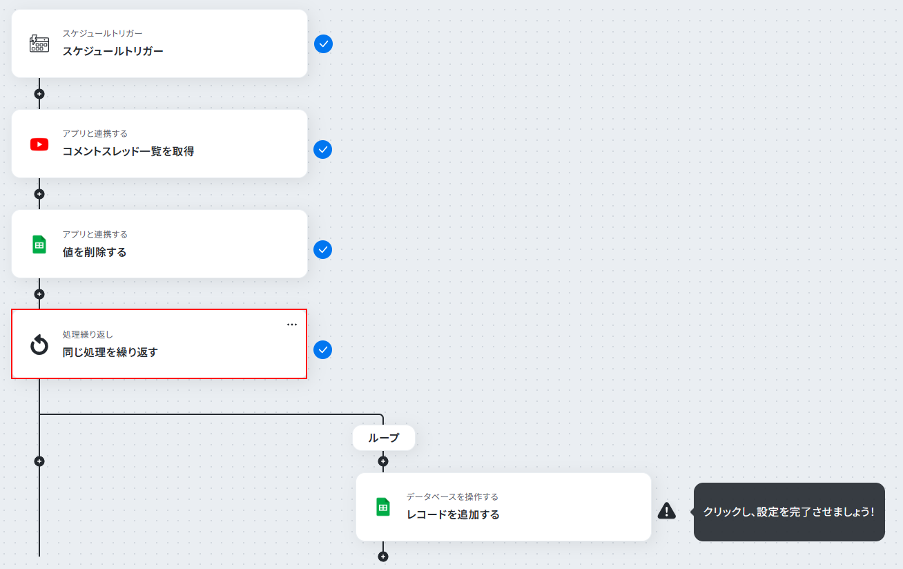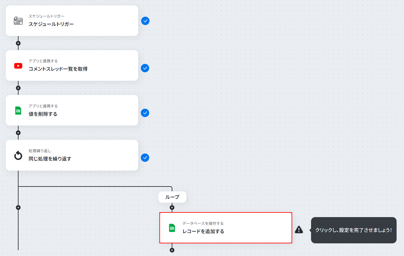 以上が、定期的にYouTubeの動画からコメント一覧を取得し、Google スプレッドシートに自動で記録するフローでした!