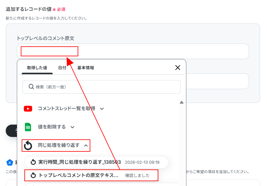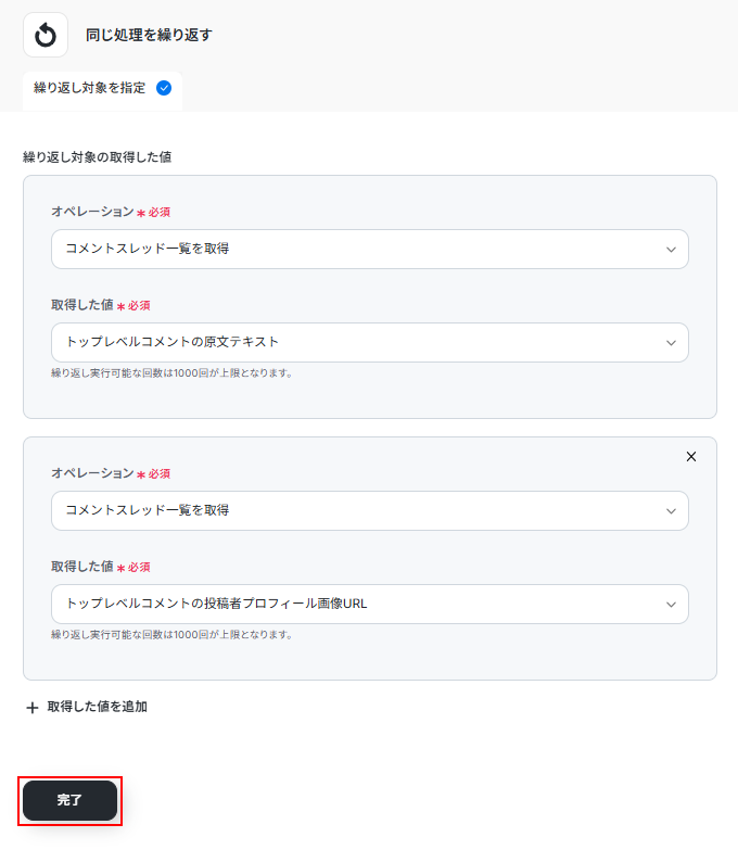 - 処理の繰り返しでは、前のステップで取得したコメント一覧のデータを繰り返し対象として任意で設定してください