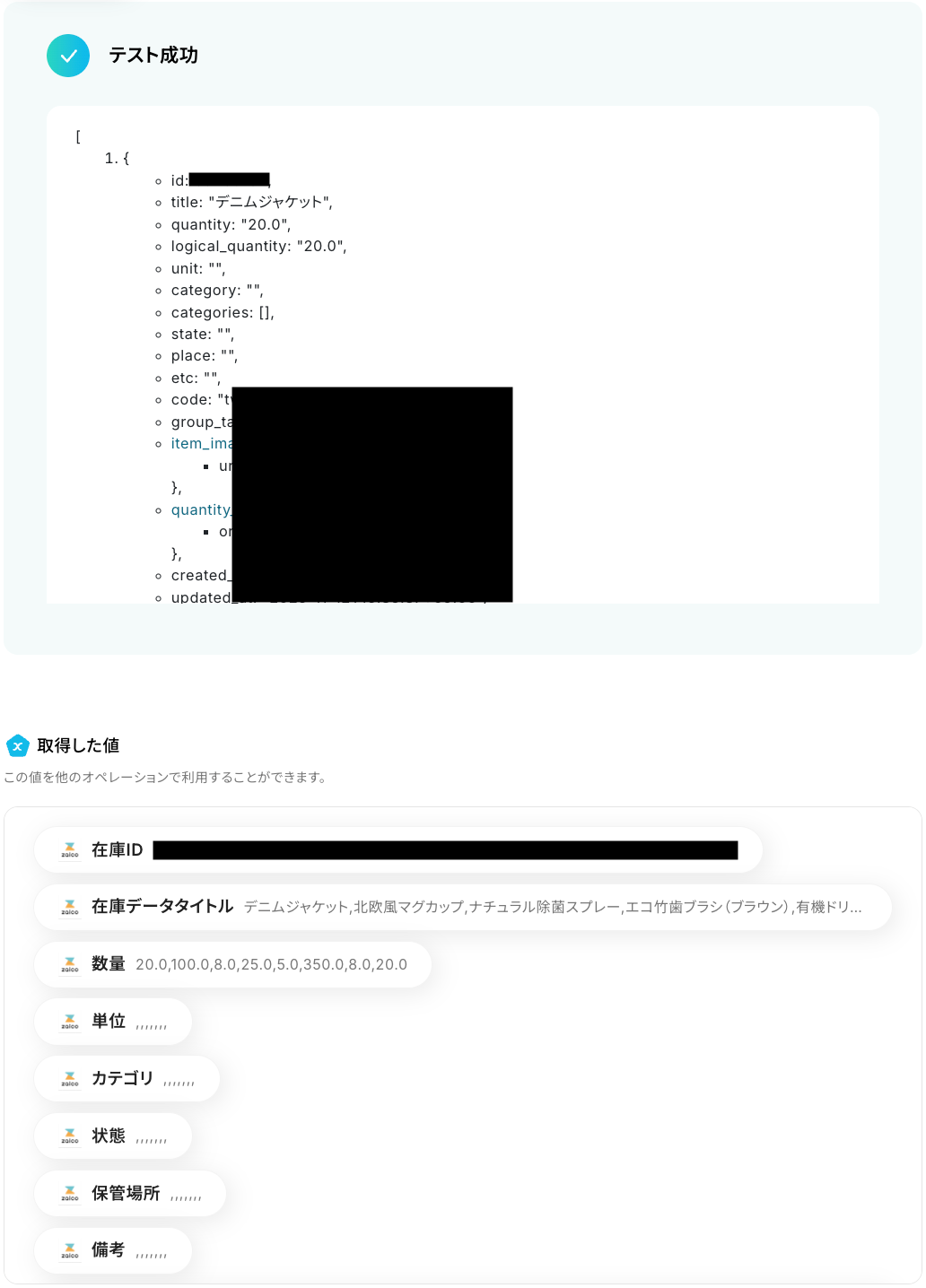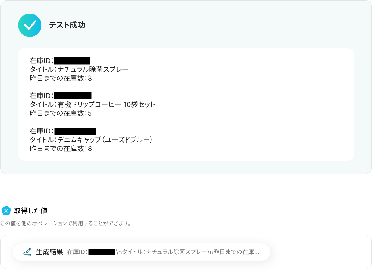 テストに成功すると、取得した在庫データの一覧に関する情報が一覧で表示されます。