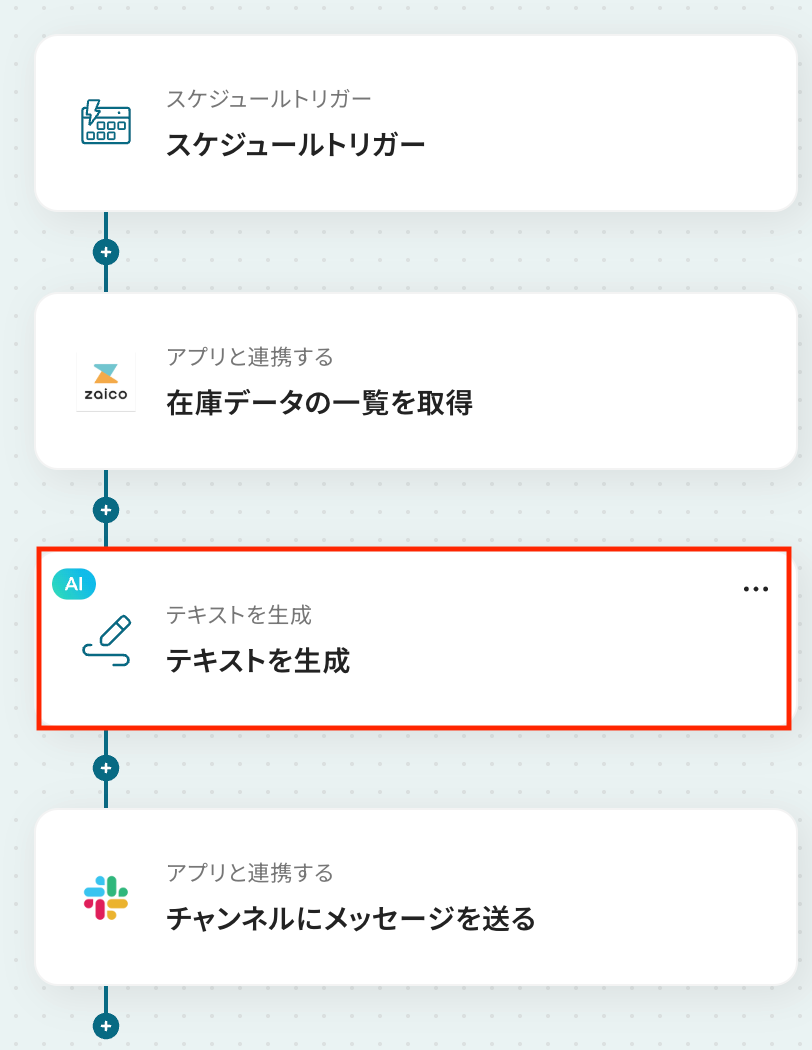 - 続けて、オペレーションでAI機能の「テキストを生成」アクションを設定し、取得した在庫情報をもとに不足している在庫をまとめるなど、通知用のメッセージを生成します