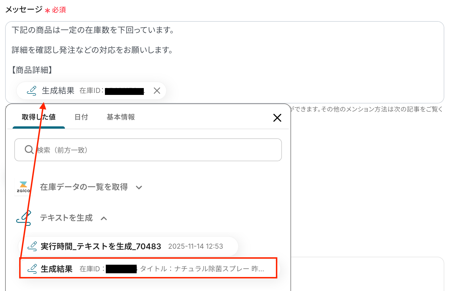 - 通知メッセージの本文は、固定のテキストを設定するだけでなく、前段のzaicoオペレーションで取得した在庫データ(商品名や在庫数など)を変数として動的に埋め込むこともできます