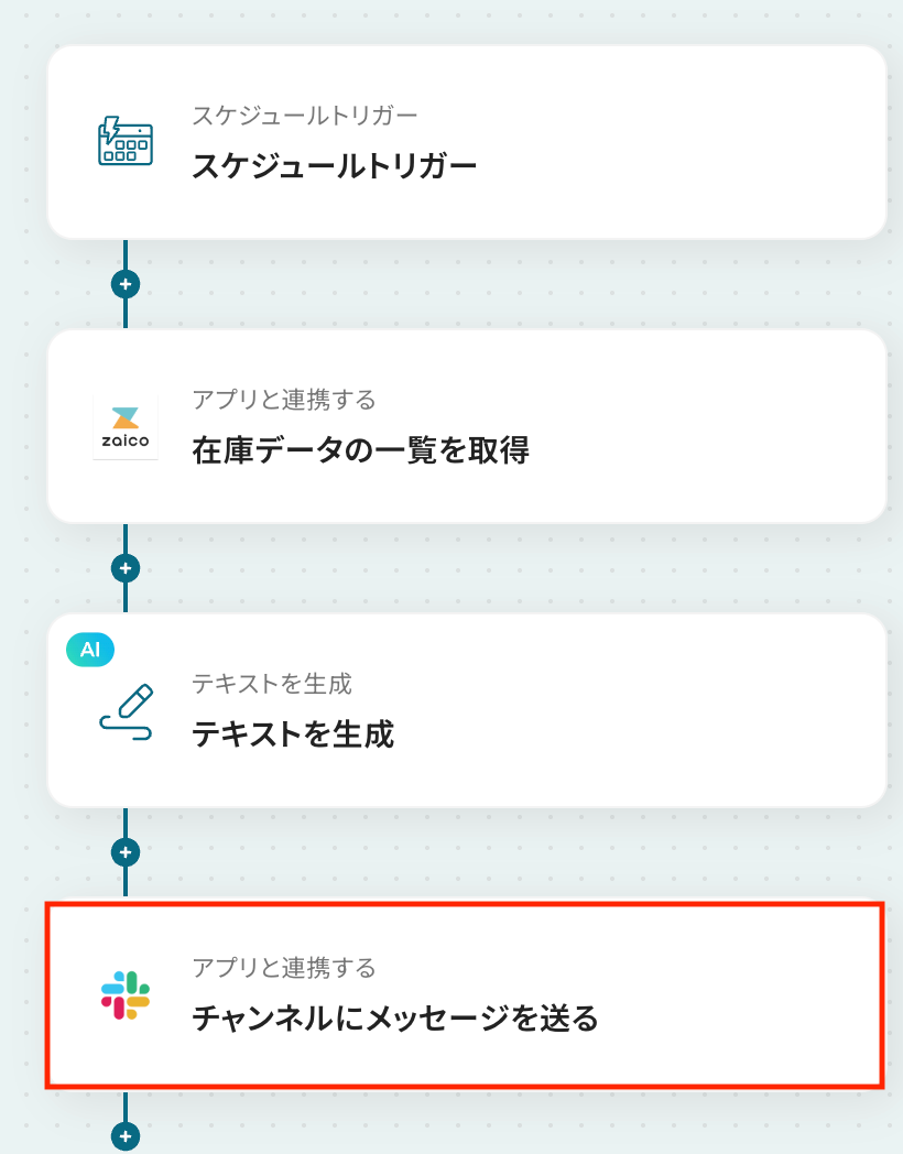 前のステップでテキスト生成した値を利用して、Slackで在庫データの不足に関するメッセージを通知しましょう。
