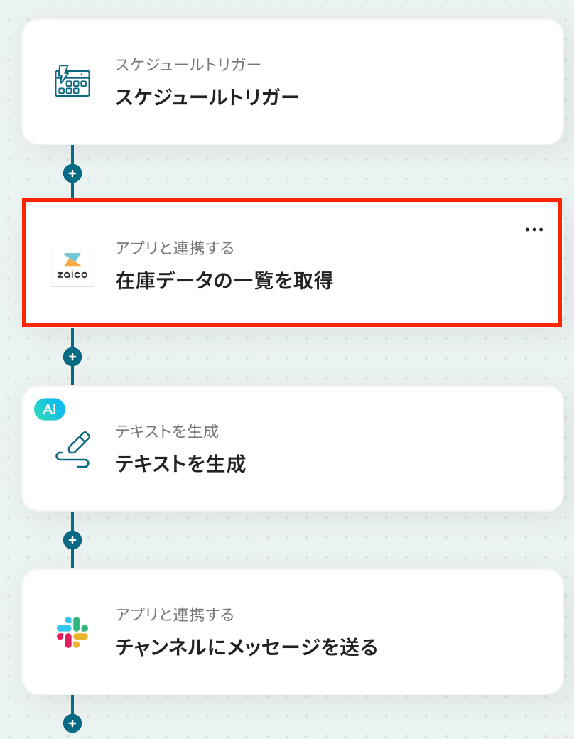 このワークフローを活用すれば、毎日決まった時間にzaicoの在庫データの一覧を自動で取得し、在庫が不足している場合にSlackへ通知することが可能になります。これにより、在庫確認業務の効率化と発注漏れの防止に貢献します。