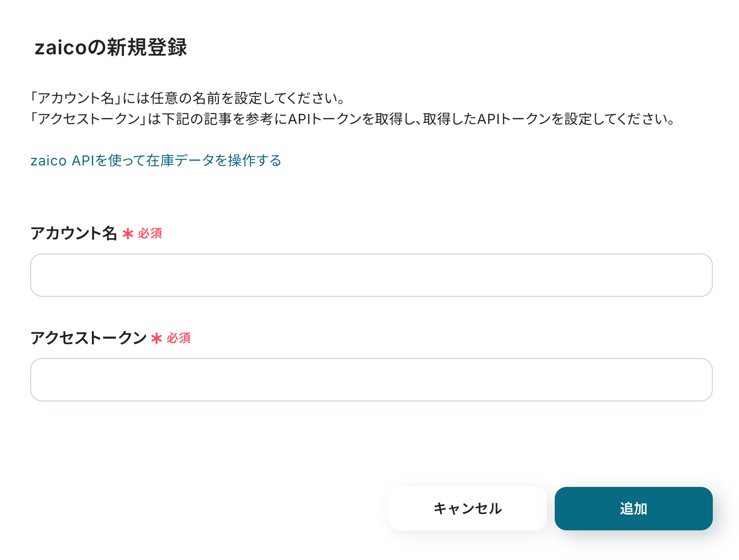 以下の画面が表示されるので、アカウント名とアクセストークンを注釈に沿って入力し、「追加」をクリックしましょう。