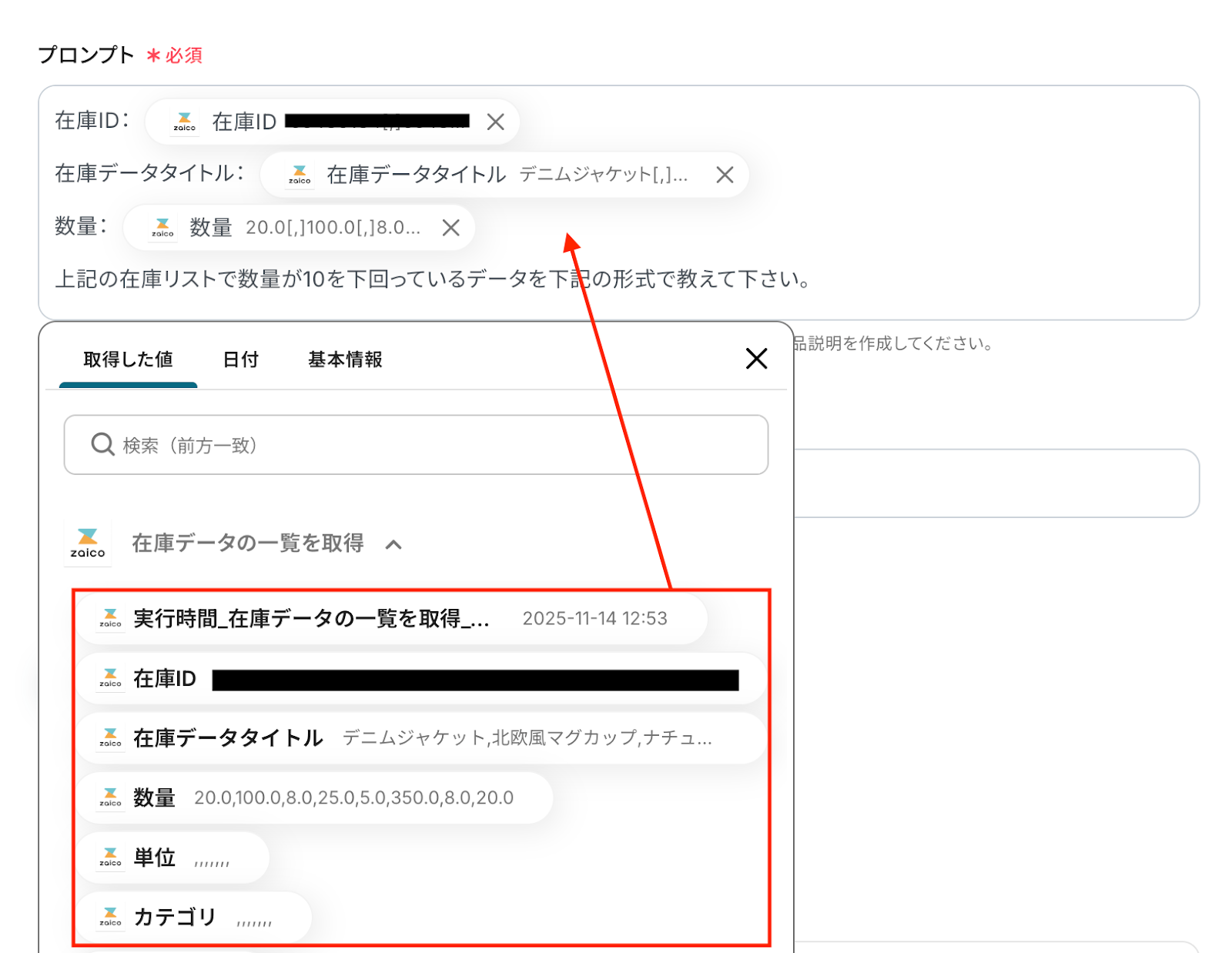 入力欄をクリックすると、前のステップでzaicoから取得した値が表示されるので、選択して入力しましょう。