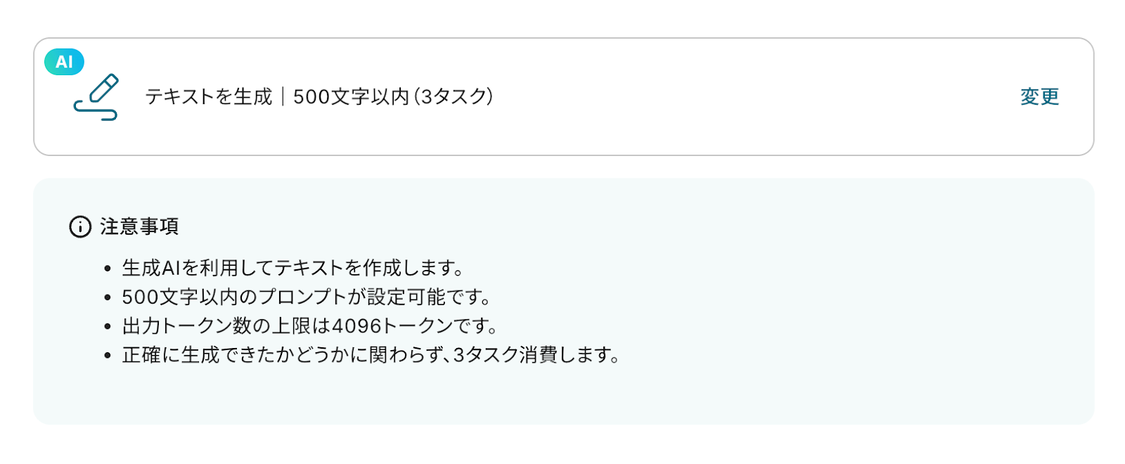 ※テキストを生成する機能のアクションは「指示可能なプロンプトの文字数」によって消費するタスク数が異なるのでご注意ください。
