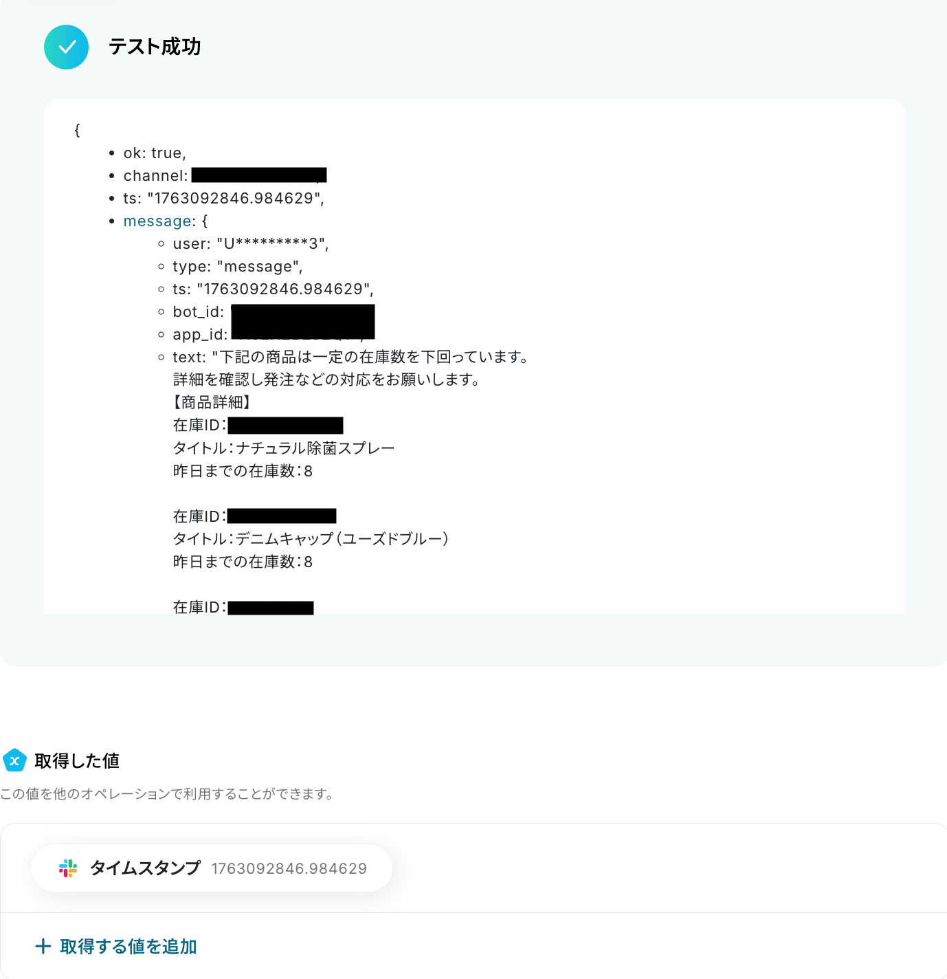 以下の画像の取得した値を利用し、このあとのステップでSlackでメッセージの送信が可能です。