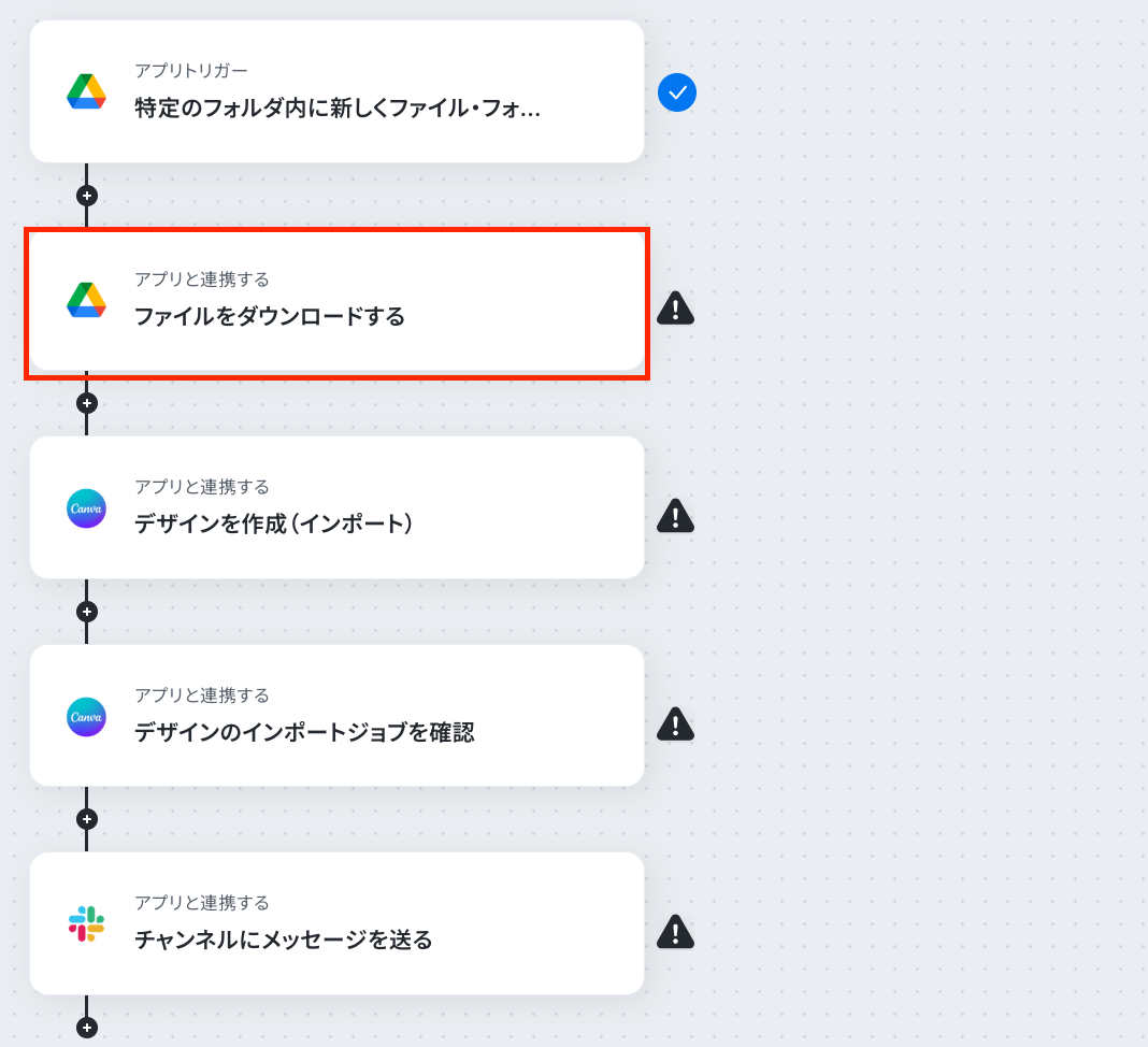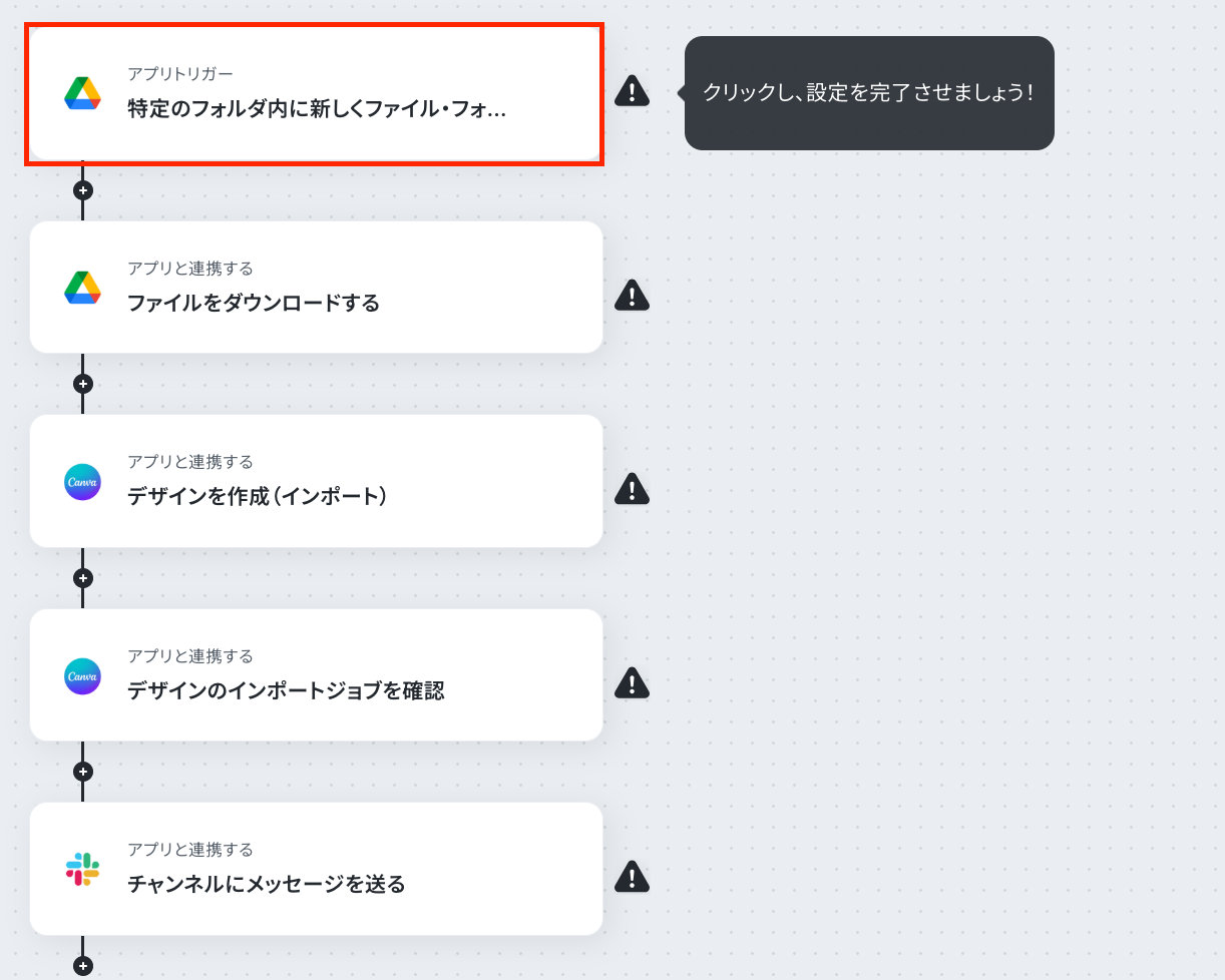 ファイルを基にCanvaでデザインを自動作成するフローを作ってみよう それではここから代表的な例として、Google Driveにファイルがアップロードされたら、その情報を基にCanvaでデザインを自動作成し、完成したらSlackに通知する フローを解説していきます!
