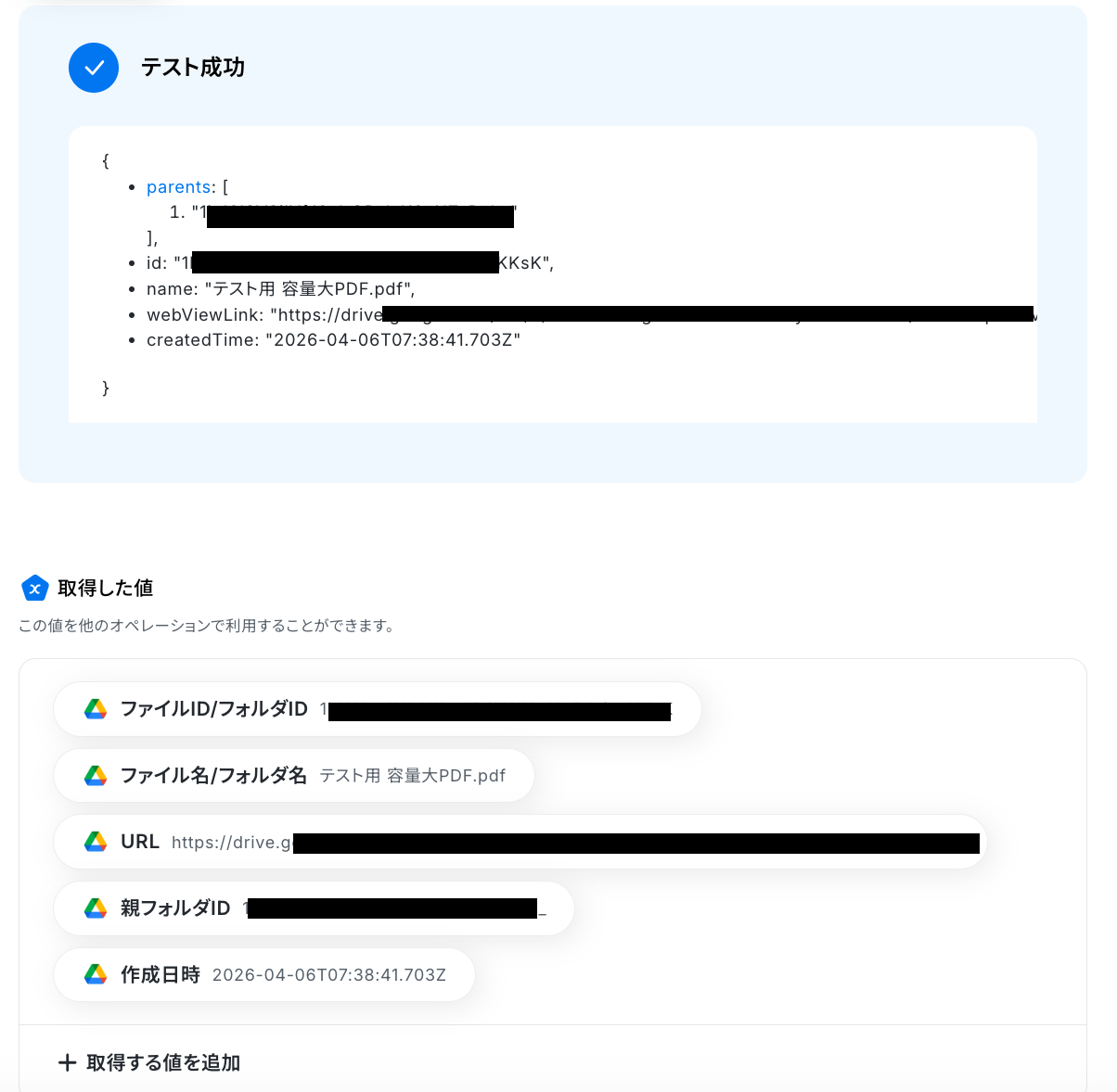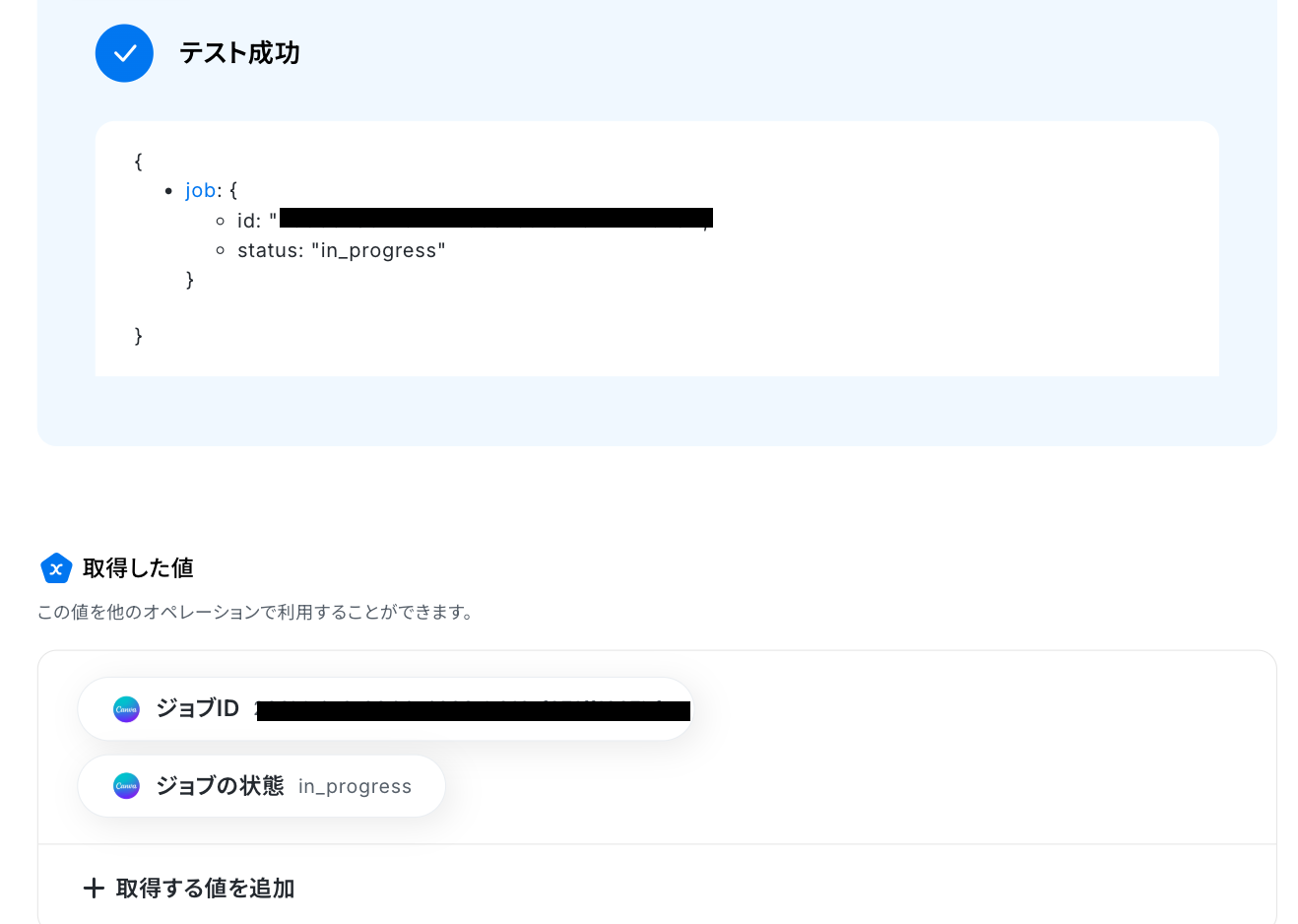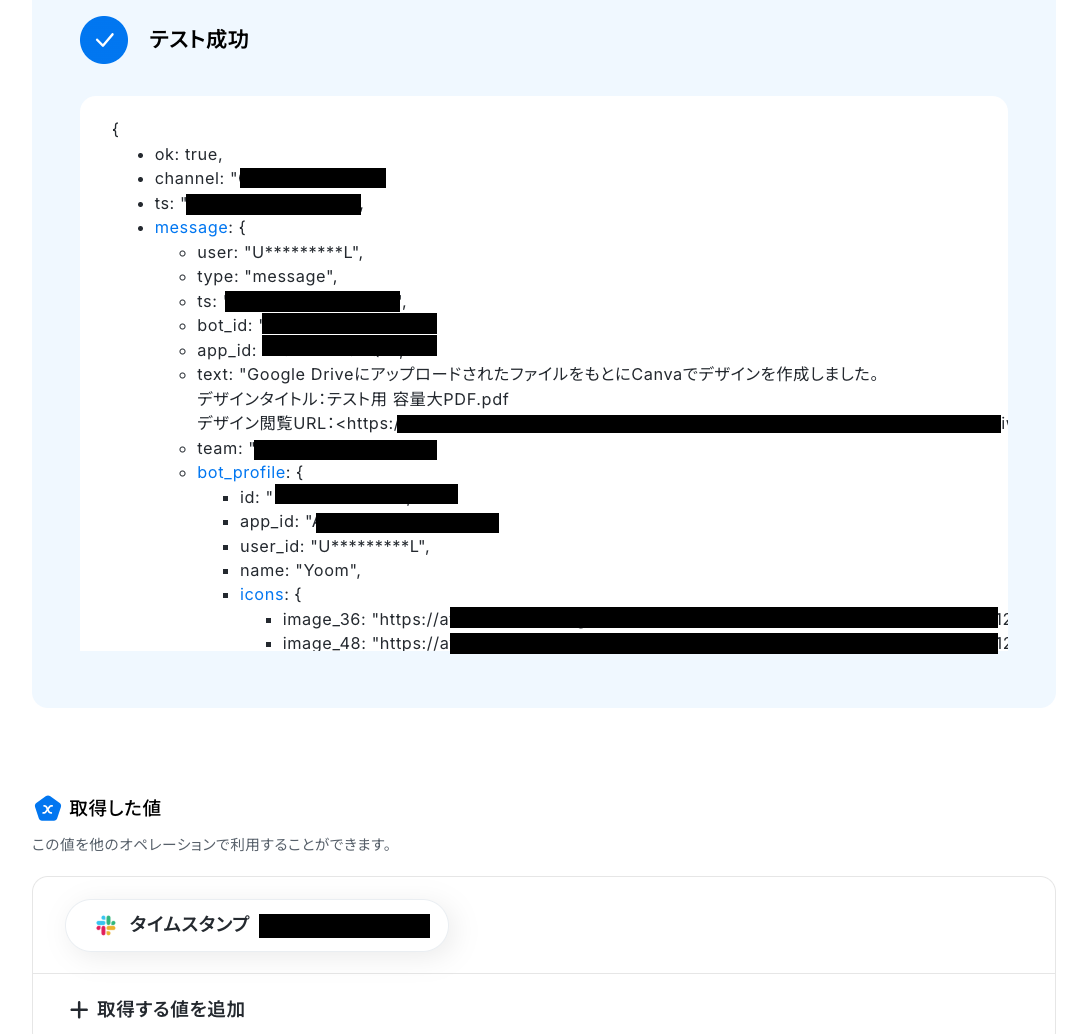 テストをクリックしましょう! テストが成功すると、取得した値が表示されます。※ 取得した値 とは? トリガーやオペレーション設定時に、「テスト」を実行して取得した値のことを指します。 後続のオペレーション設定時の値として利用でき、フローボットを起動する度に変動した値となります。